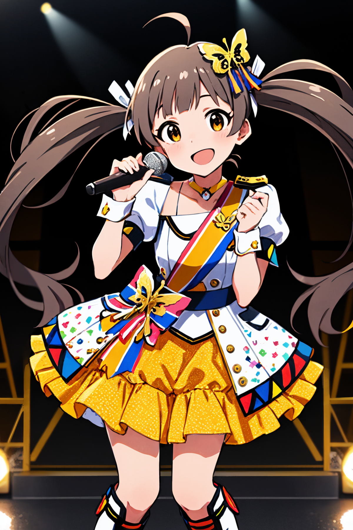 hakozaki serika, twintails, ahoge, brand new performance, white jacket, multicolored jacket, polka dot jacket, puffy short sleeves, yellow skirt, frilled skirt, polka dot skirt, butterfly ornament, butterfly hair ornament, knee boots, white footwear, wrist cuffs, white ribbon, sash, buttons, chokerSummer uniform series (Outfit name: Summer junior high school) / 夏服シリーズ (衣装名: サマージュニアハイスクール)