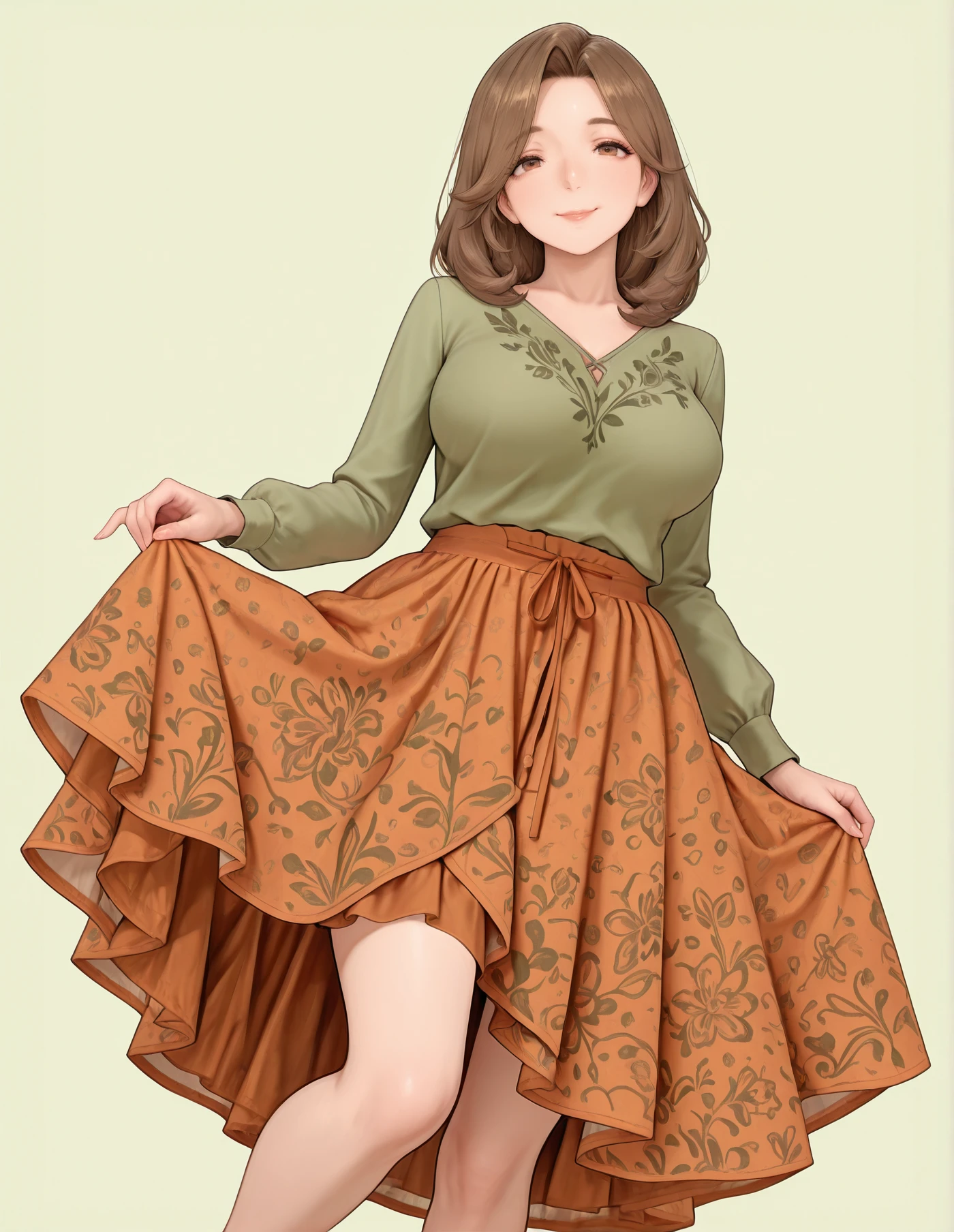 shirt, long sleeves, layered skirt, floral print, (color) shirt, (color) skirt