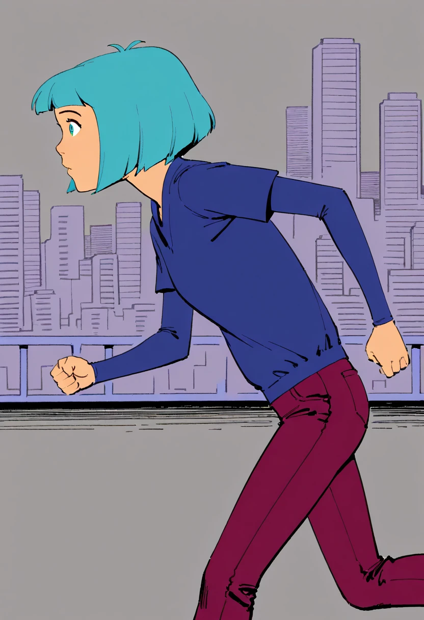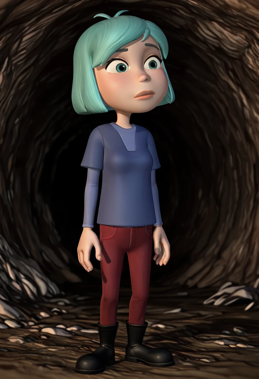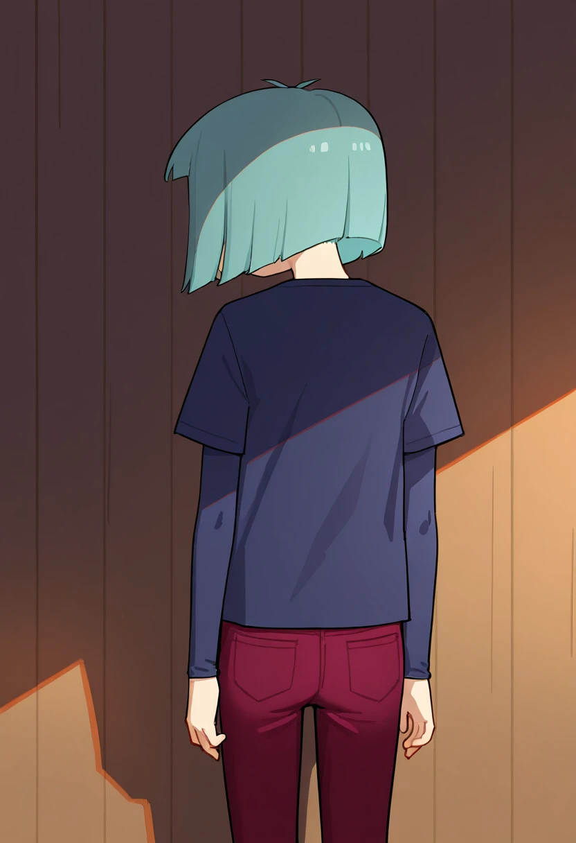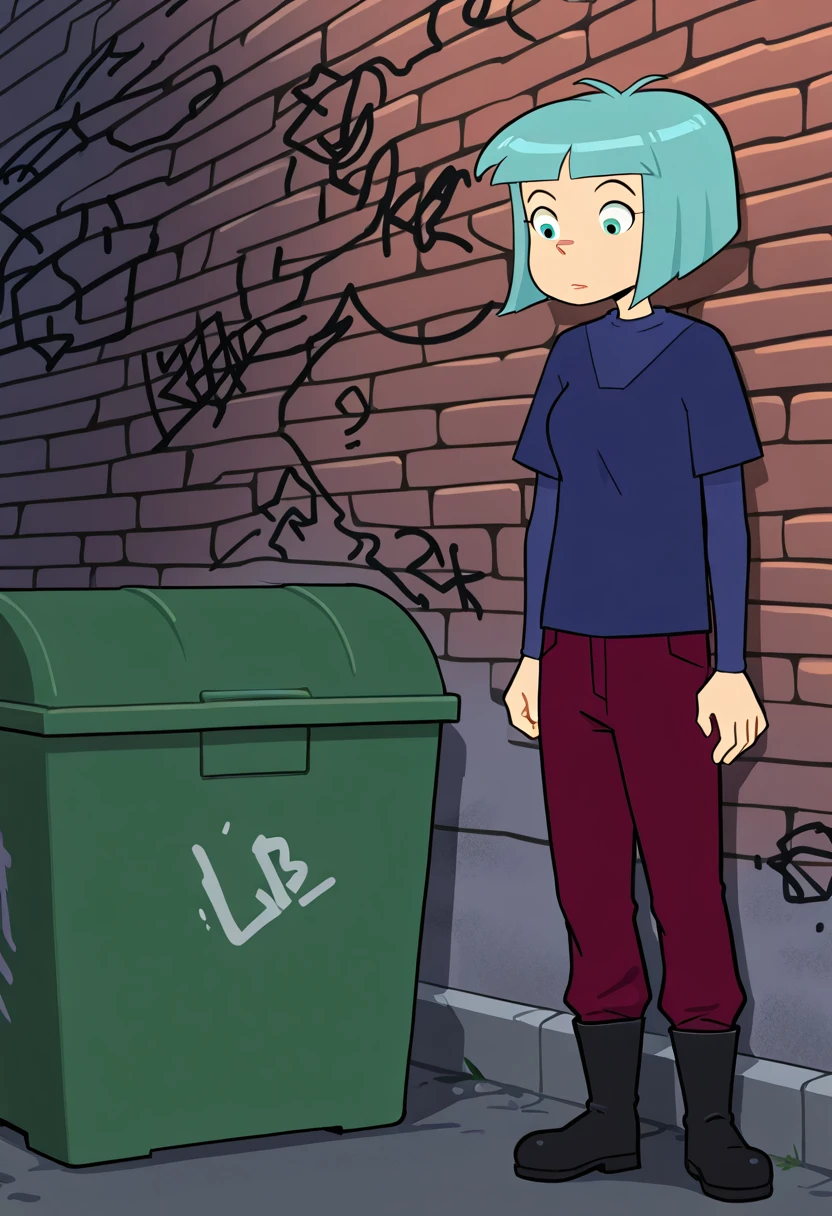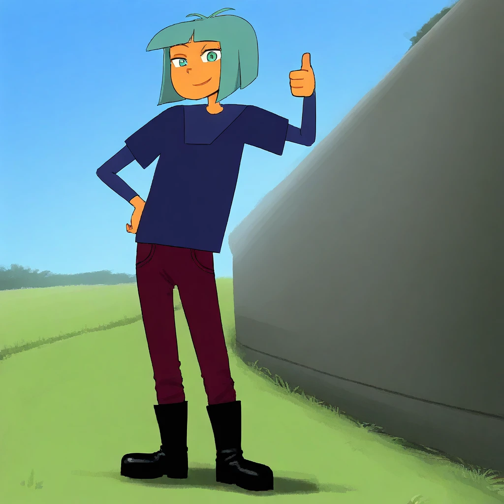 Outfit: blue shirt, short over long sleeves, red jeans, pants tucked in, black boots,