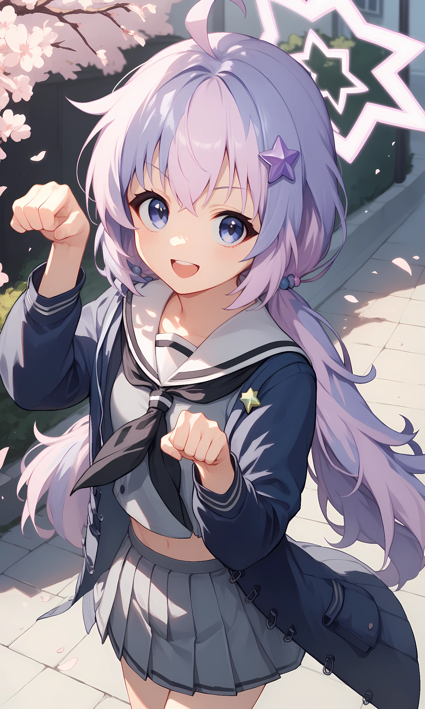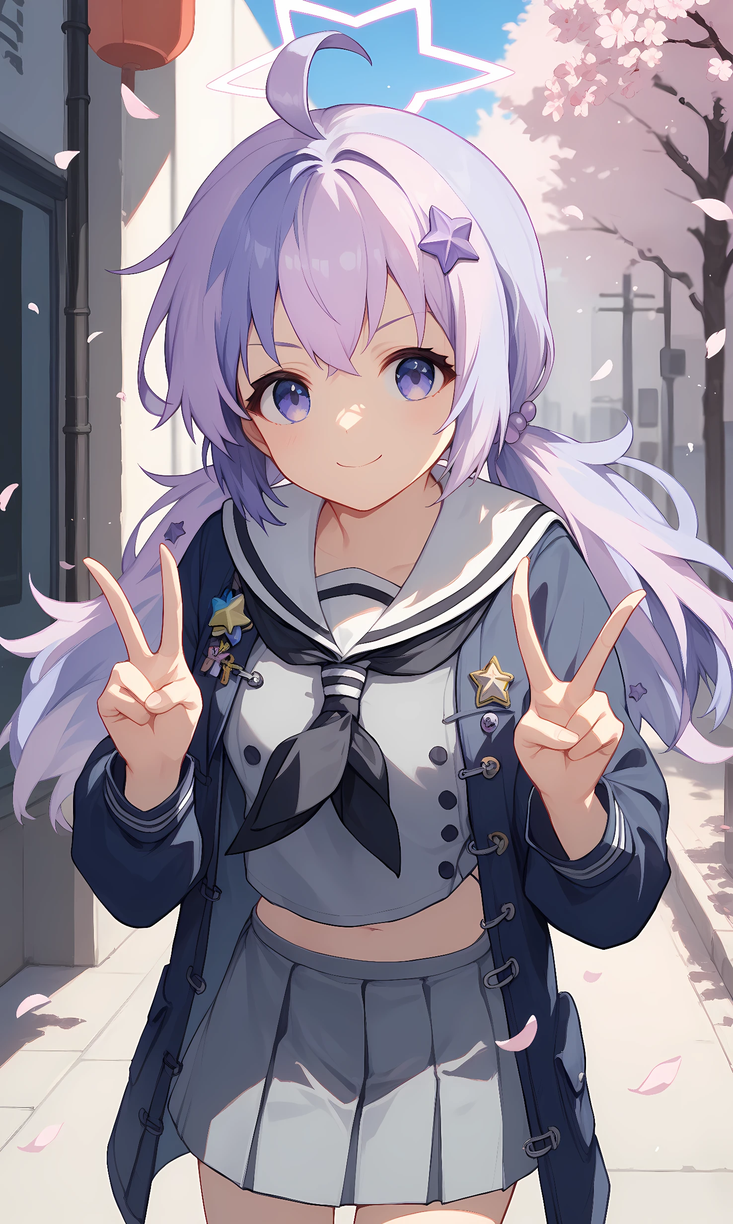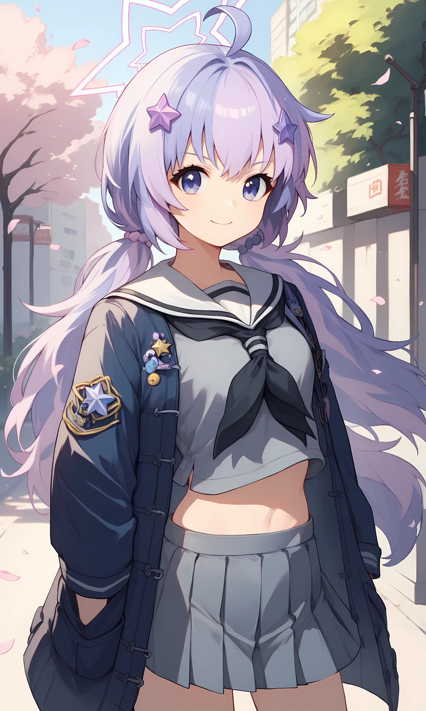 school uniform, white serafuku, black neckerchief, blue jacket, coat, midriff peek, open clothes, grey shirt, grey skirt, star hair ornament, striped socks, sneakers