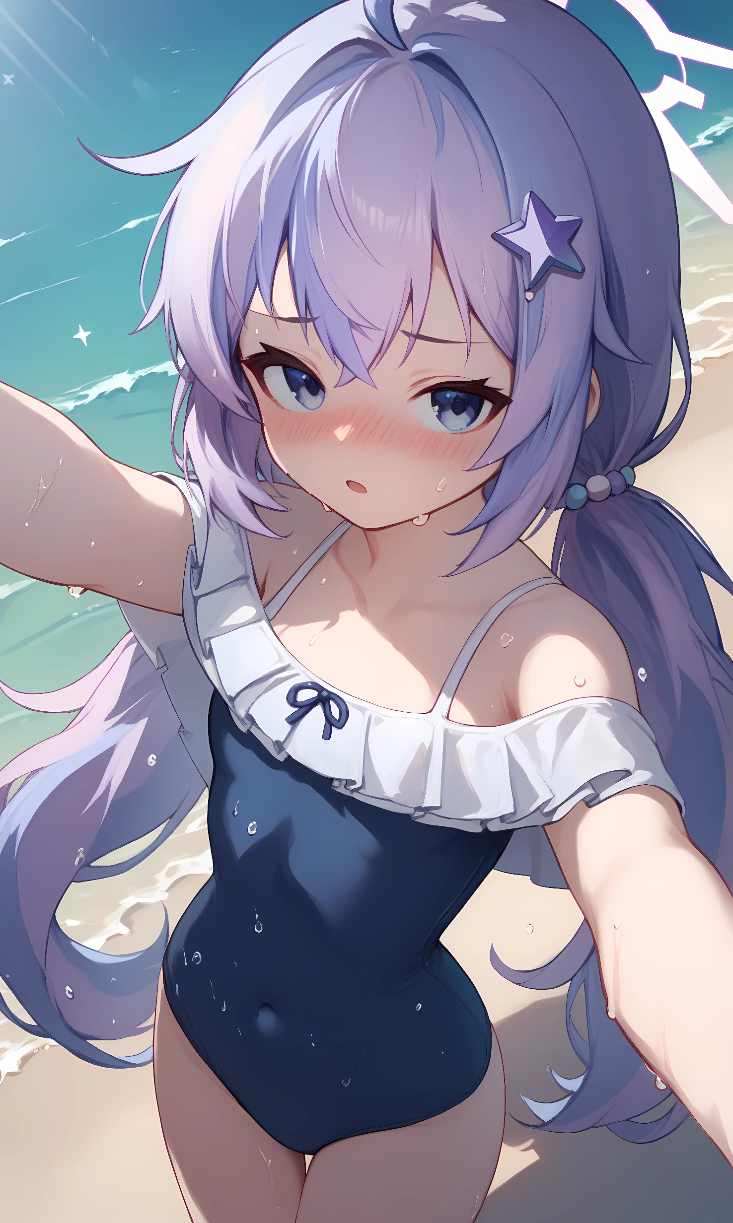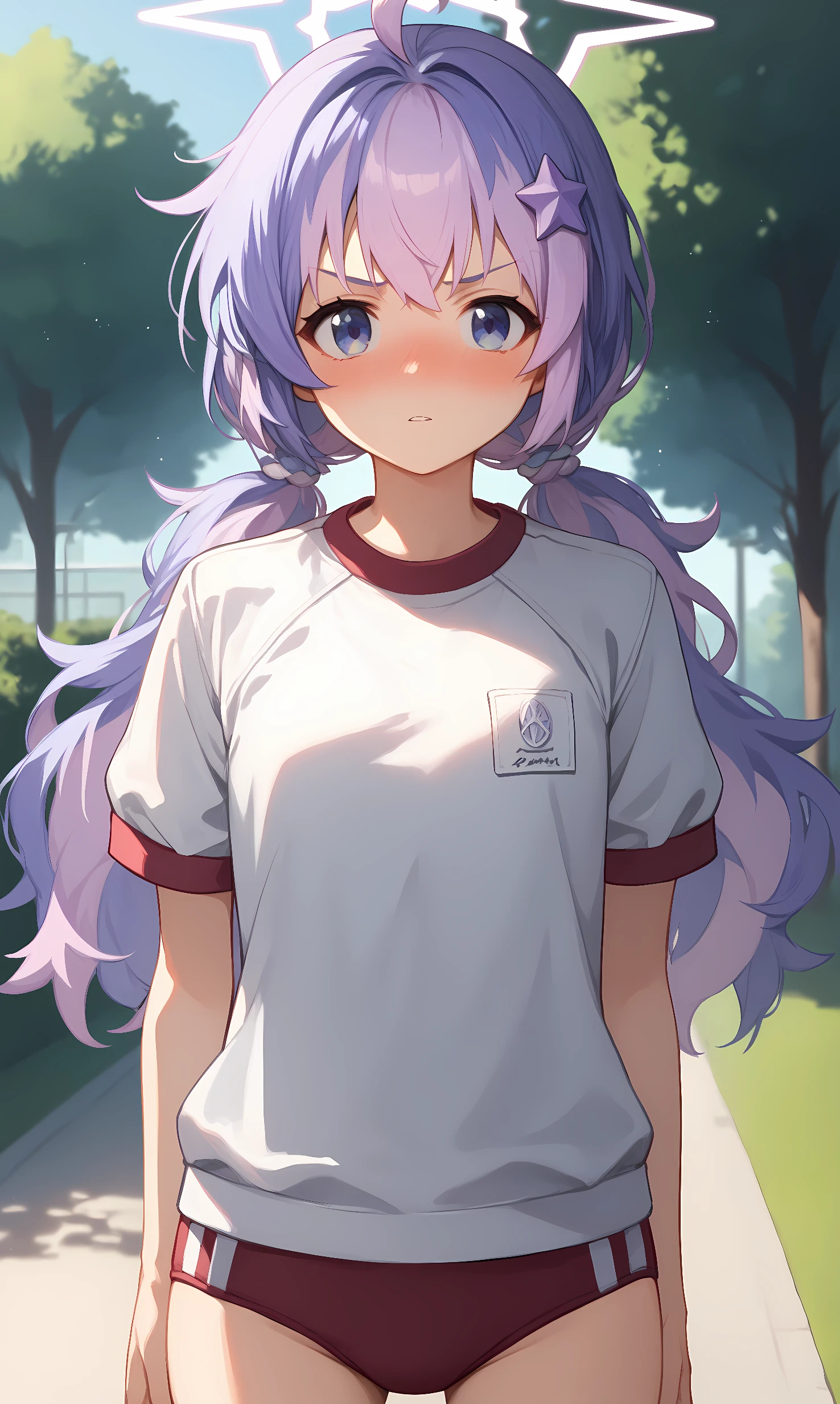 reisa, blue eyes, purple hair, multicolored hair, ahoge, low twintails, halo