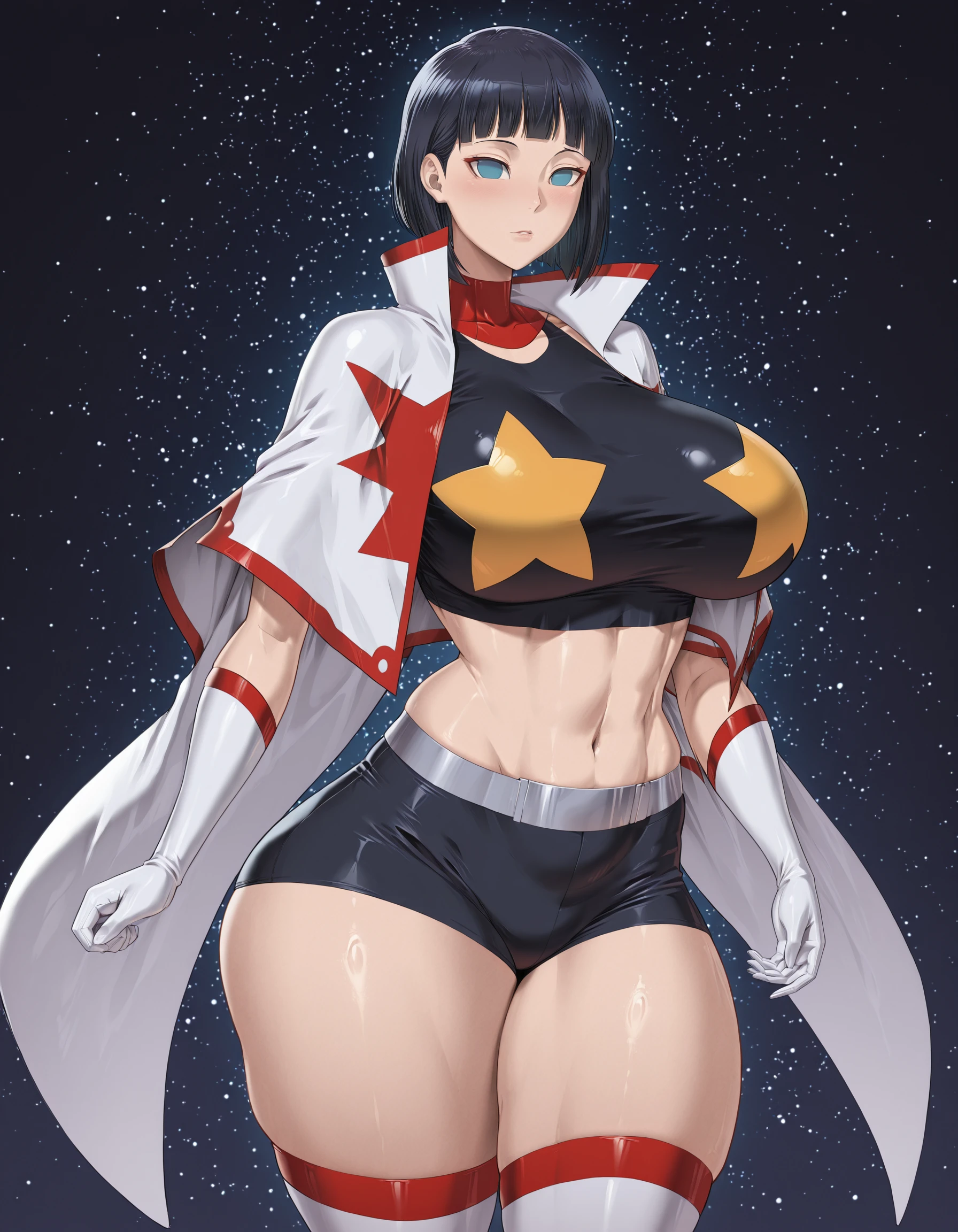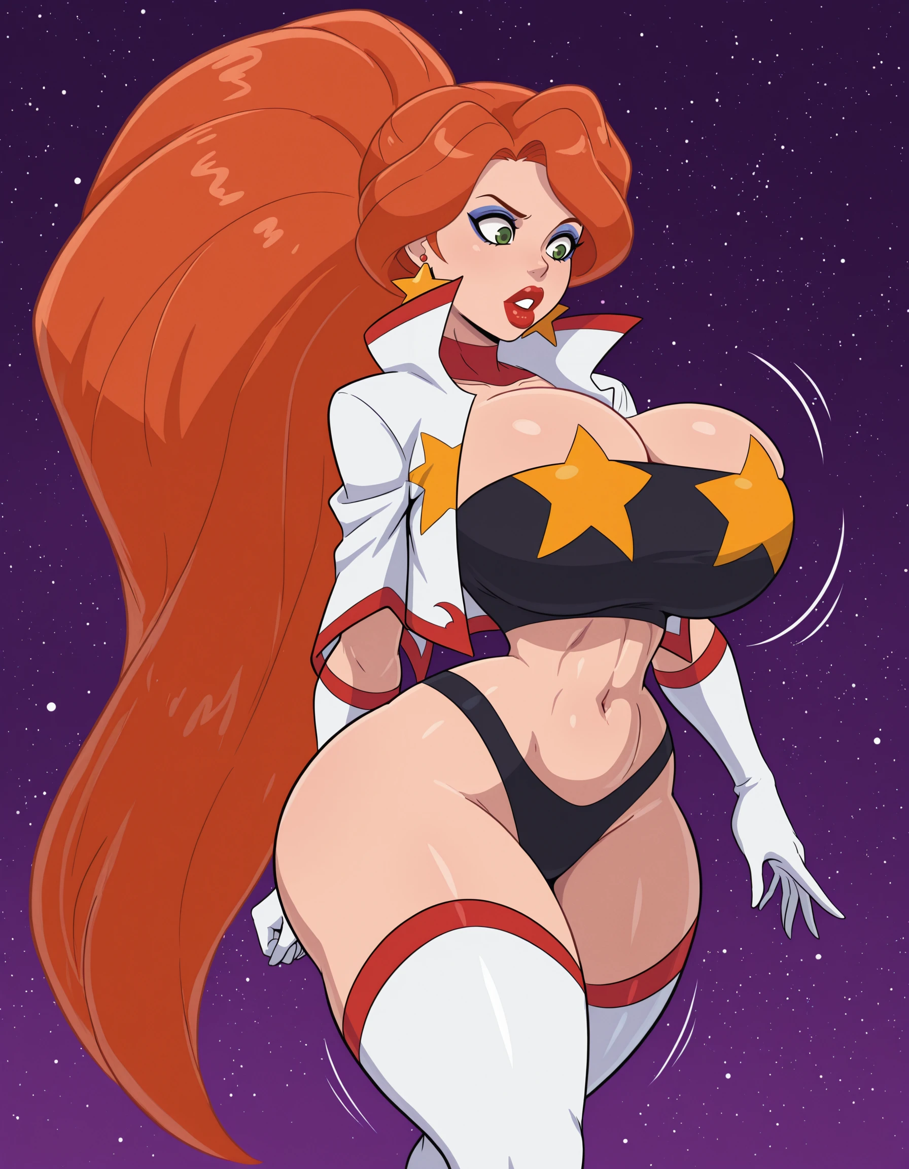 cosplay,white gloves,space yoko (cosplay),thighhighs,tube top,thigh boots,white jacket,,star pasties,