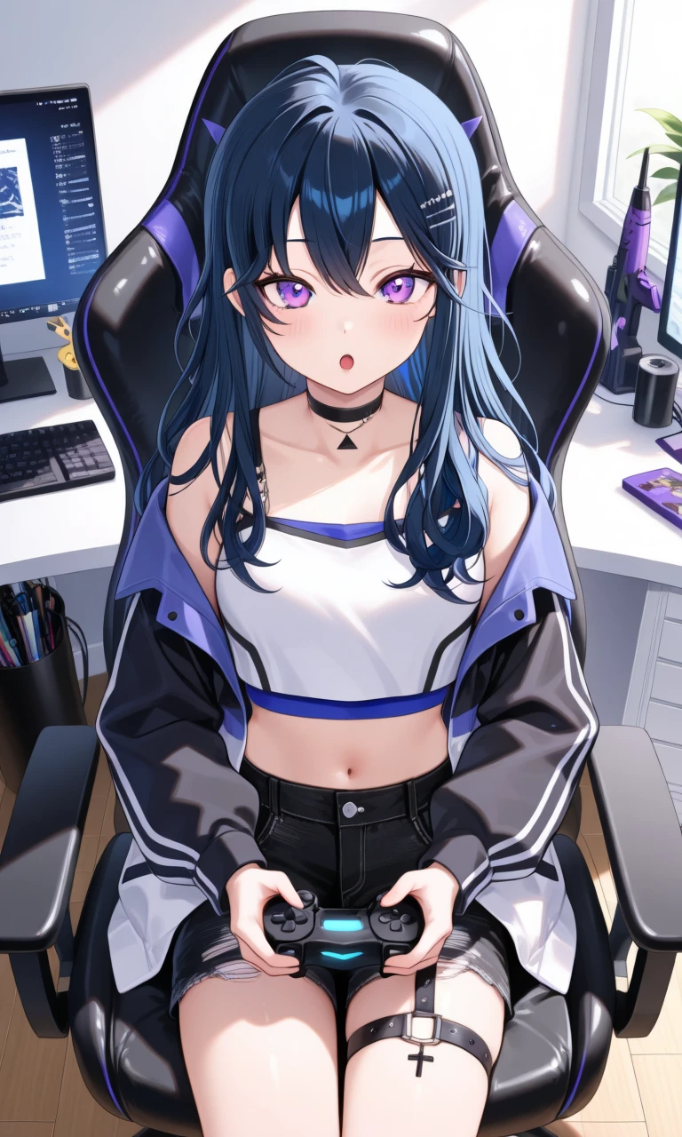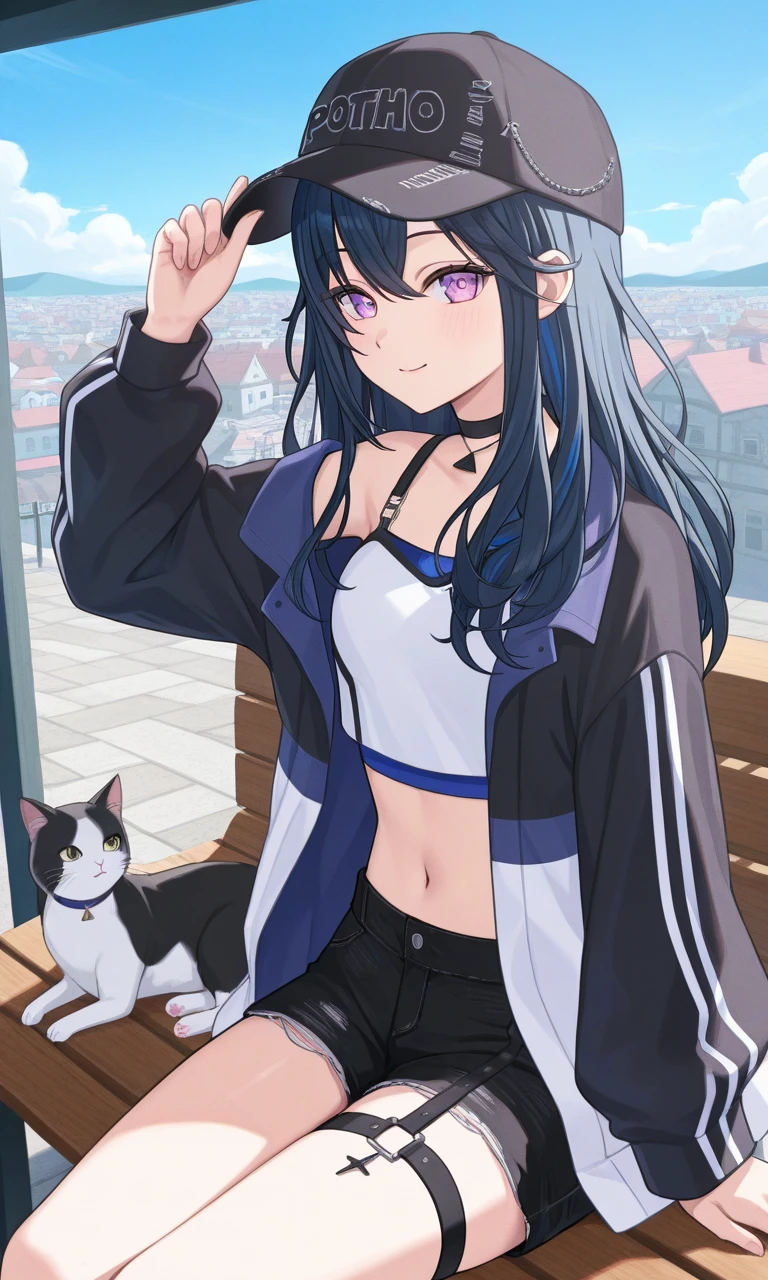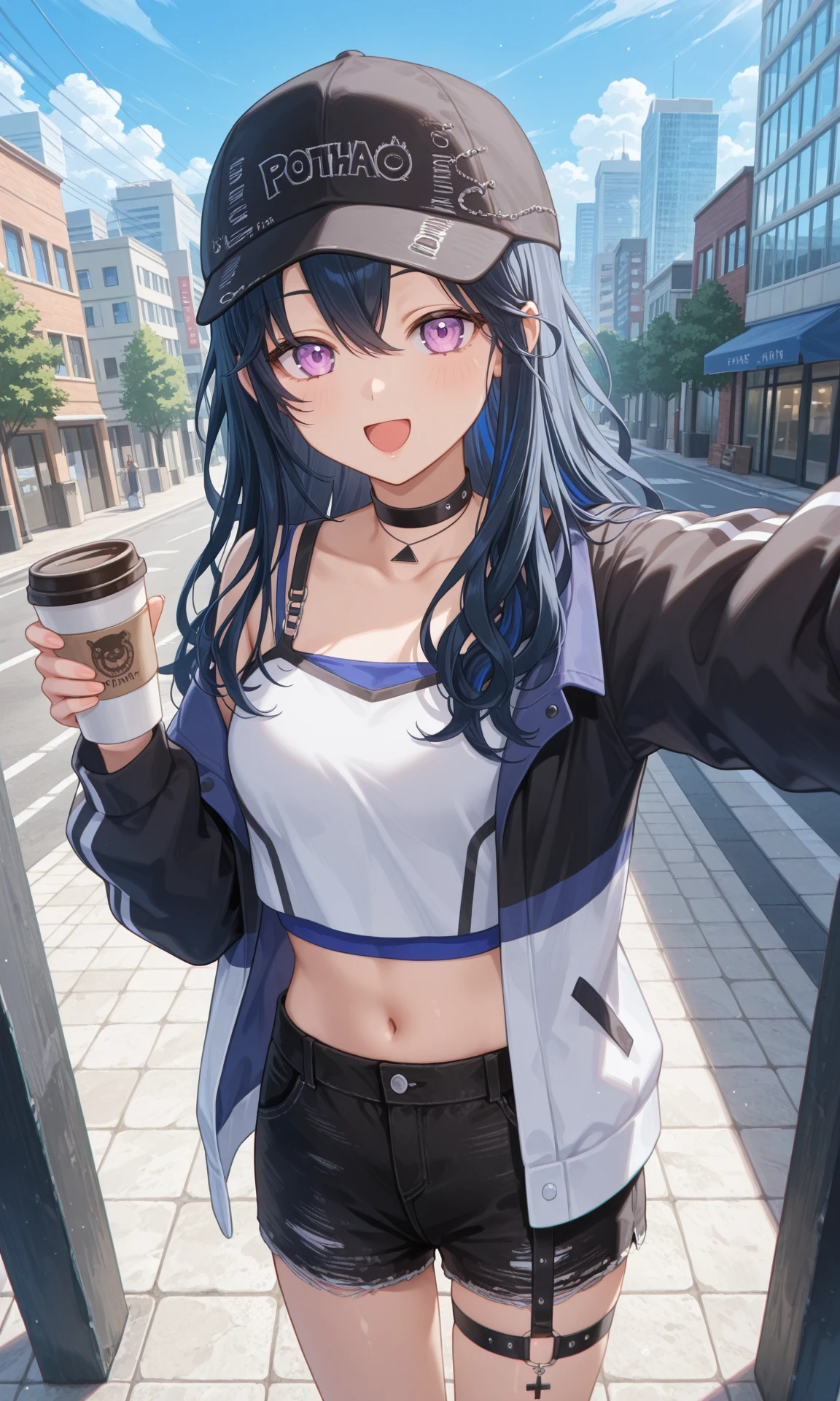 uruha re1st, baseball cap, long hair, choker, multicolored jacket, , white crop top, midriff, navel, black shorts, thigh strap