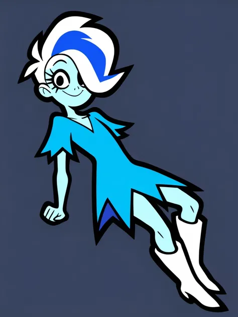 phantyil, ghost girl, colored skin, blue skin, multicolored hair, white hair, blue hair, short hair, two-tone hair, hair over one eye, black eyes, eyelashes, blue dress, torn clothes, short sleeves, white boots
