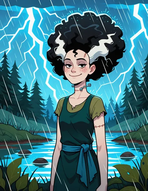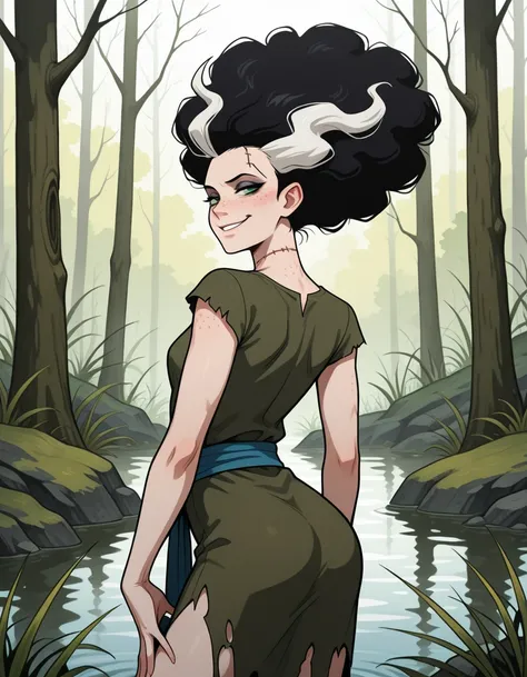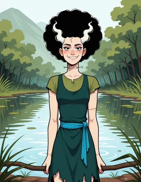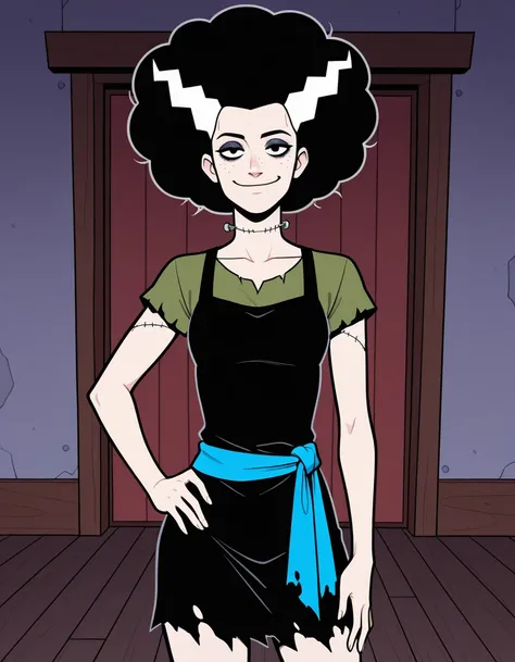 elsafil, freckles, electrodes on neck, black hair, white hair, multicolored hair, streaked hair, stitches, afro, torn clothes, dark green dress, sleeveless dress, green shirt, short sleeves, shirt under dress, blue sash, sandals