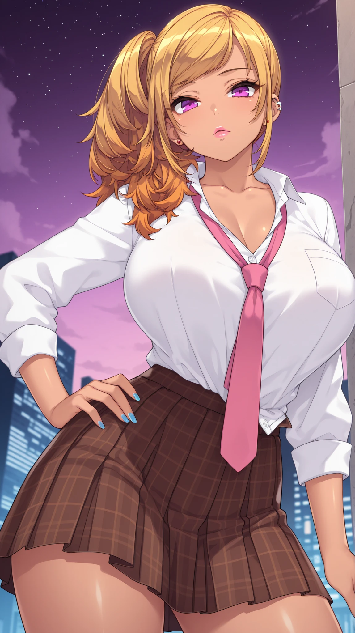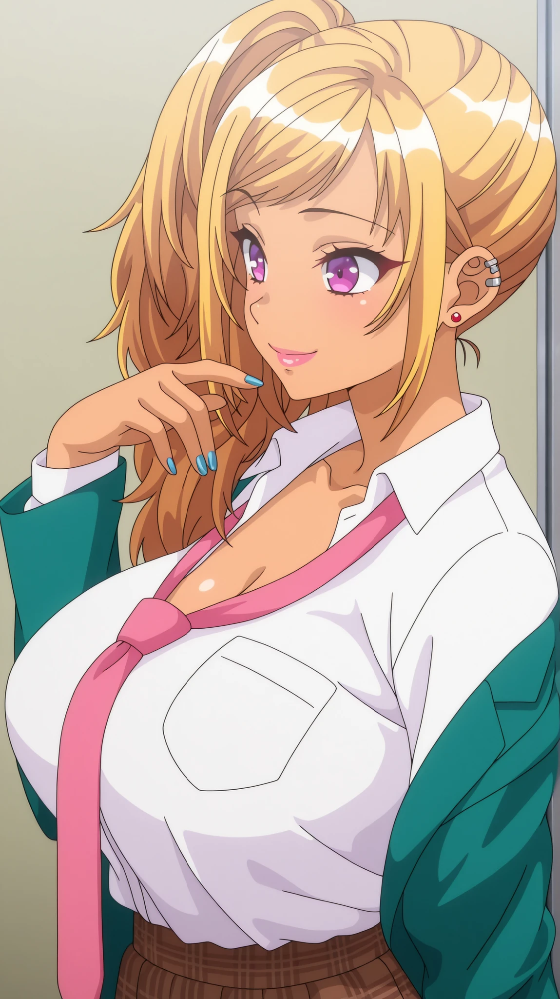 ruisa, 1girl, multicolored hair, blonde hair, orange hair, long hair, side ponytail, swept bangs, purple eyes, large breasts, dark-skinned female, pink lips, light blue nails,