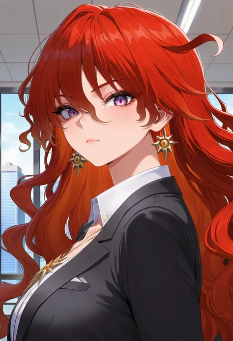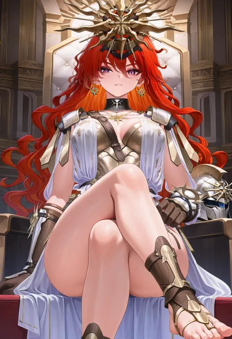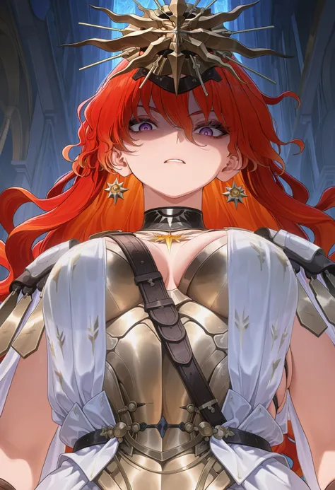 Augusta, earrings, wavy hair, purple eyes, red hair, helmet, armor, masterpiece, best quality, amazing quality, very aesthetic, high resolution, ultra-detailed, Negative prompts