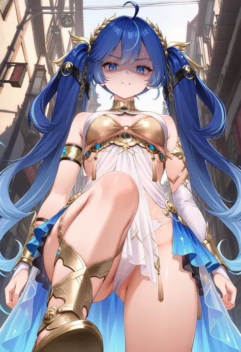 Luno, blue eyes, twintails, blue hair, dress, ahoge, armlet, underwear, detached sleeves, bracelet, masterpiece, best quality, amazing quality, very aesthetic, high resolution, ultra-detailedNegative prompts