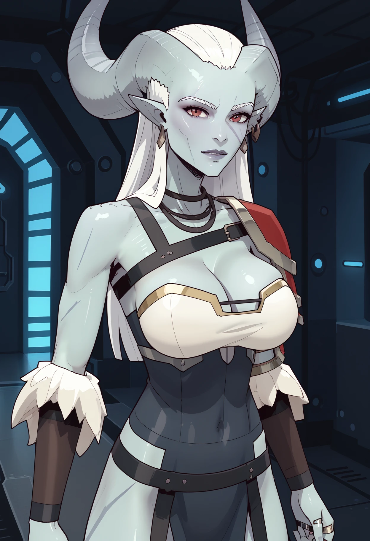 recommended tags: 1girl, solo, alien, horns, pointy ears, colored skin, blue skin, white hair, long hair, scar, breasts, large breasts,