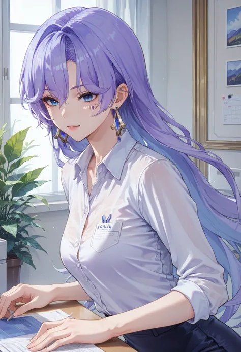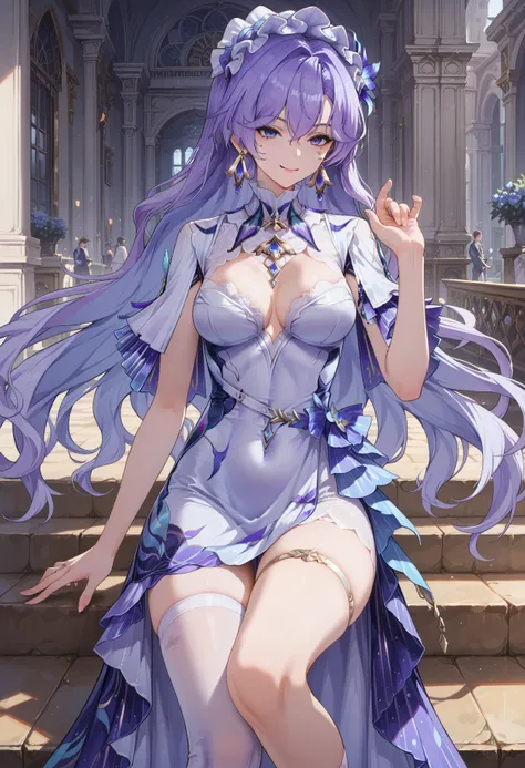 score_9, score_8_up, score_7_up, source_anime, 1girl, solo, Cantarella, long hair, purple hair, earrings, blue eyes, white dress,Negative prompts