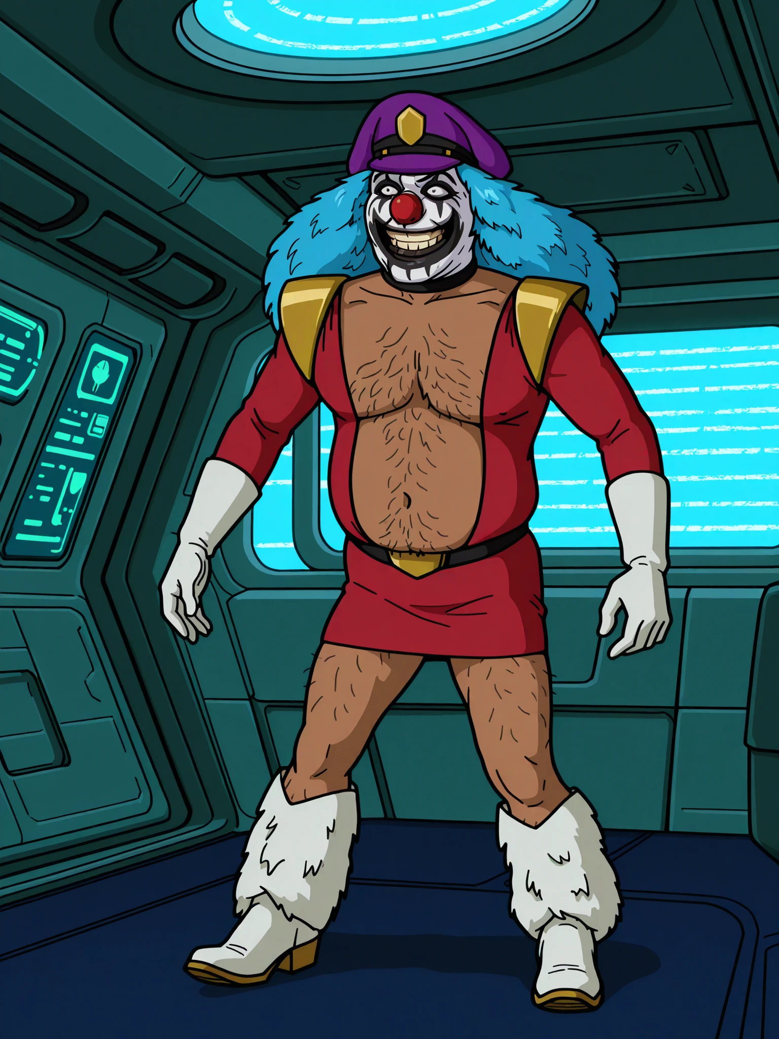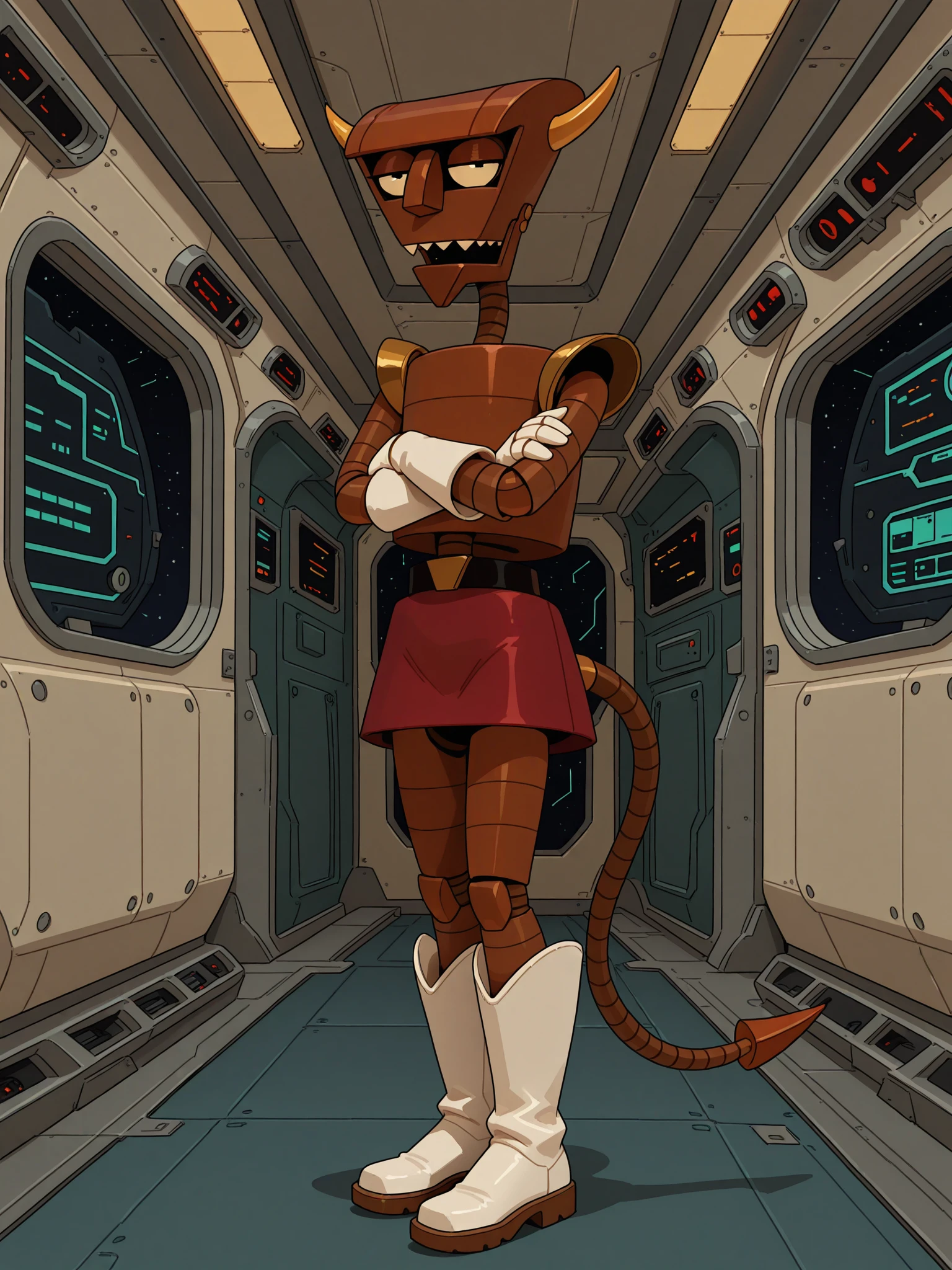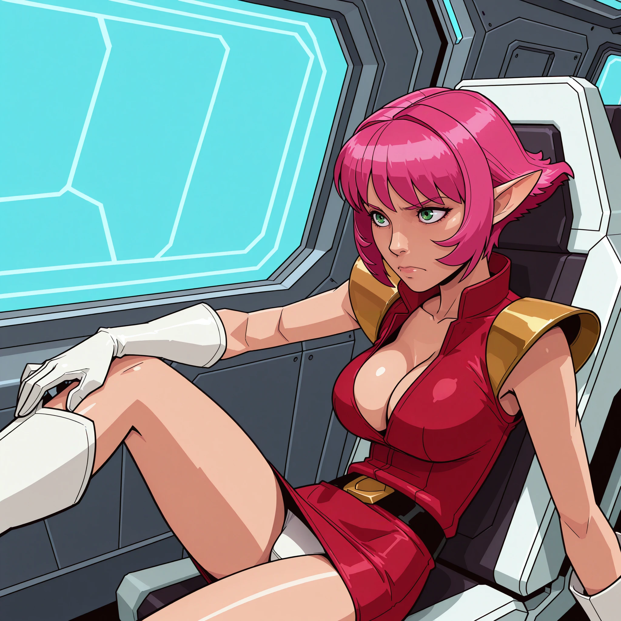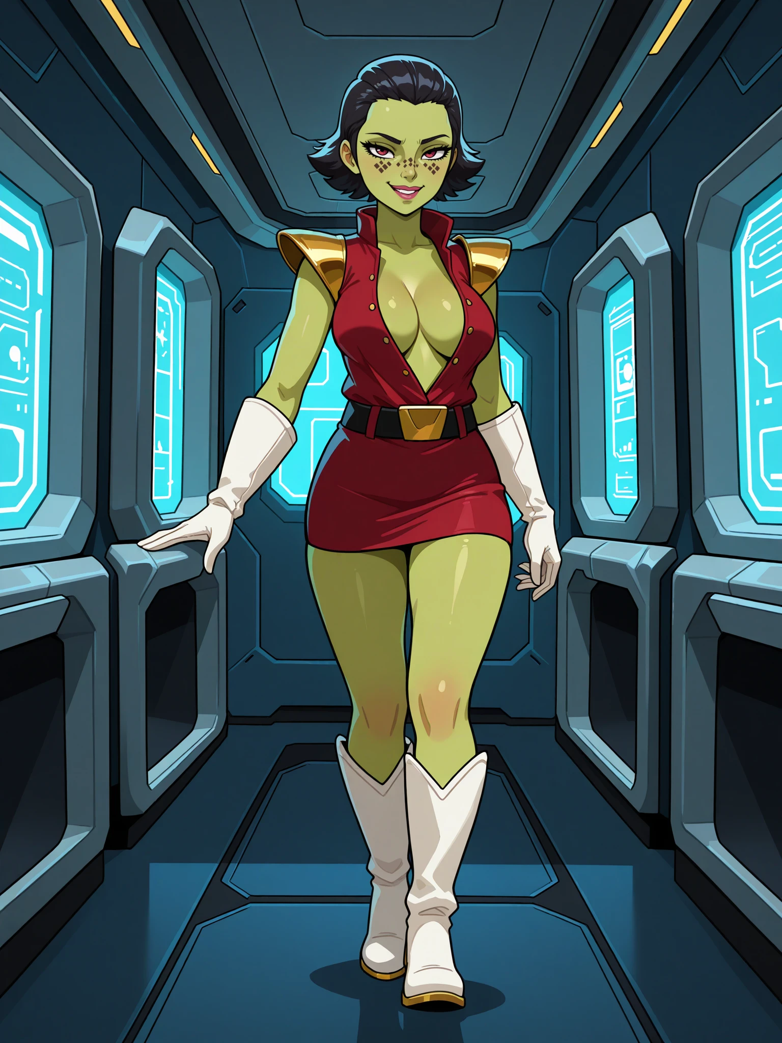 Triggers: doopuniform, military uniform, red shirt, sleeveless , collar, gold shoulder pads, black belt, gold buckle, red microskirt, white gloves, white boots