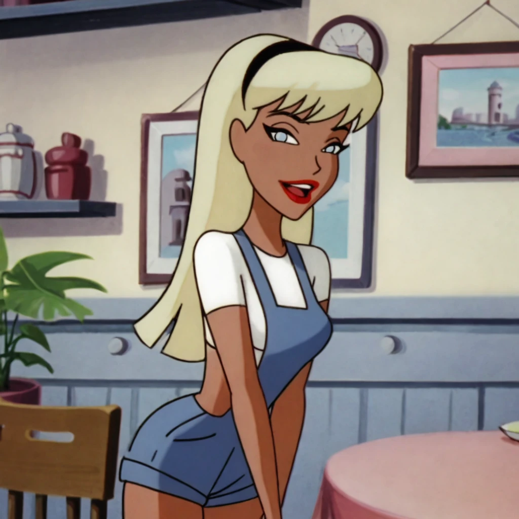Trigger with overalls: SupergirlOveralls, 1girl, red lips, long hair, retro artstyle, hairband, white shirt, crop top, overalls, lipstick, short sleeves, blonde hair, 1980s (style), makeup, cropped shirt, overall shorts, dark-skinned female, dark skin, cowboy shot