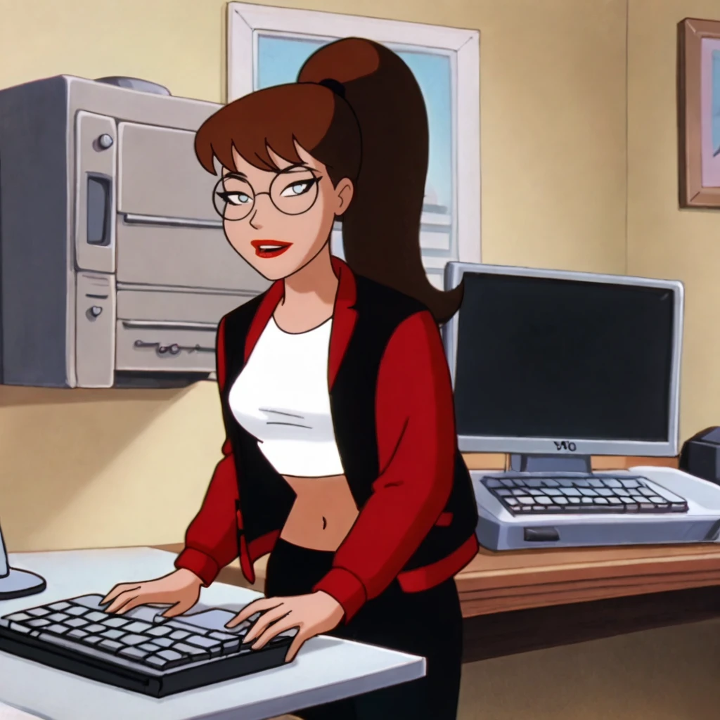 SupergirlBrownHair, 1girl, glasses, brown hair, navel, ponytail, midriff, keyboard (computer), lipstick, jacket, red lips, makeup, crop top, black pants, long hair, shirt, cowboy shot