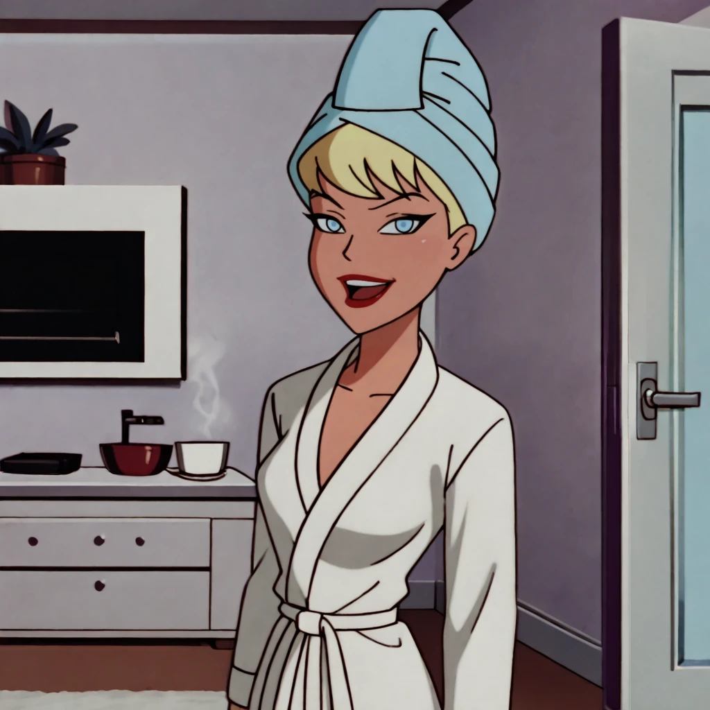 Trigger with bath robe: SupergirlRobe, 1girl, bathrobe, blonde hair, lipstick, makeup, red lips, short hair, breasts, hat, blue eyes, cowboy shot