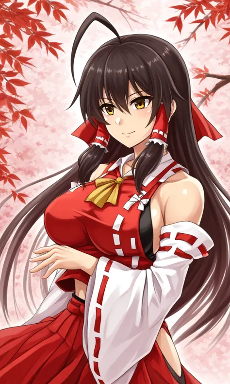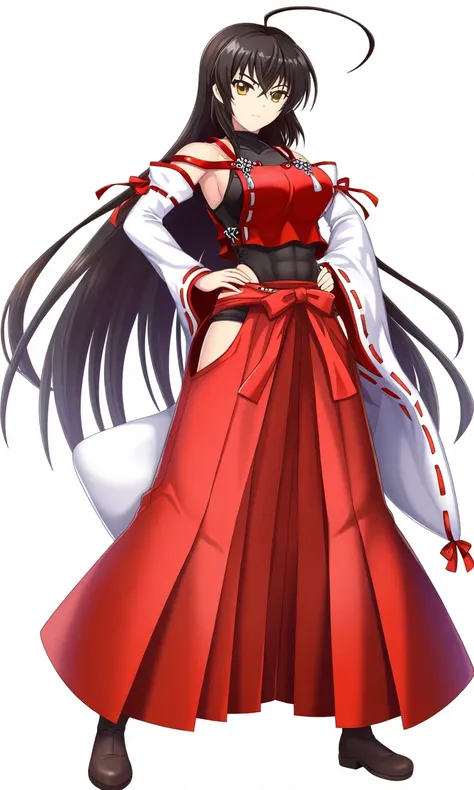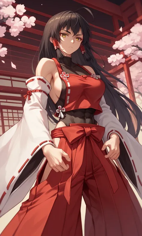 sendai hakurei no miko, 1girl, sideboob, red hakama, solo, leotard under clothes, black leotard, japanese clothes, nontraditional miko, black hair, hakama pants, yellow eyes, large breasts, detached sleeves, huge ahoge, very long hair, toned, hip vent