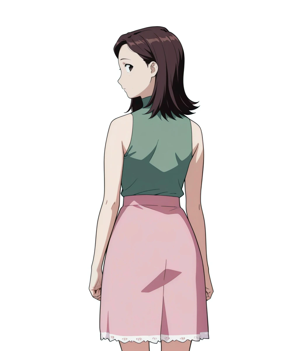 turtleneck, sleeveless, bare shoulders, green shirt, pink skirt, lace-trimmed skirt, medium skirt