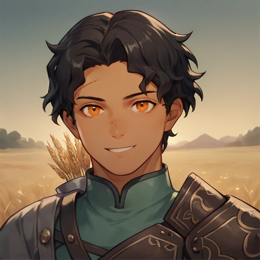 black hair, wavy hair, orange eyes, scar on forehead, dark skin: his facial feature, hairstyle, and skin.