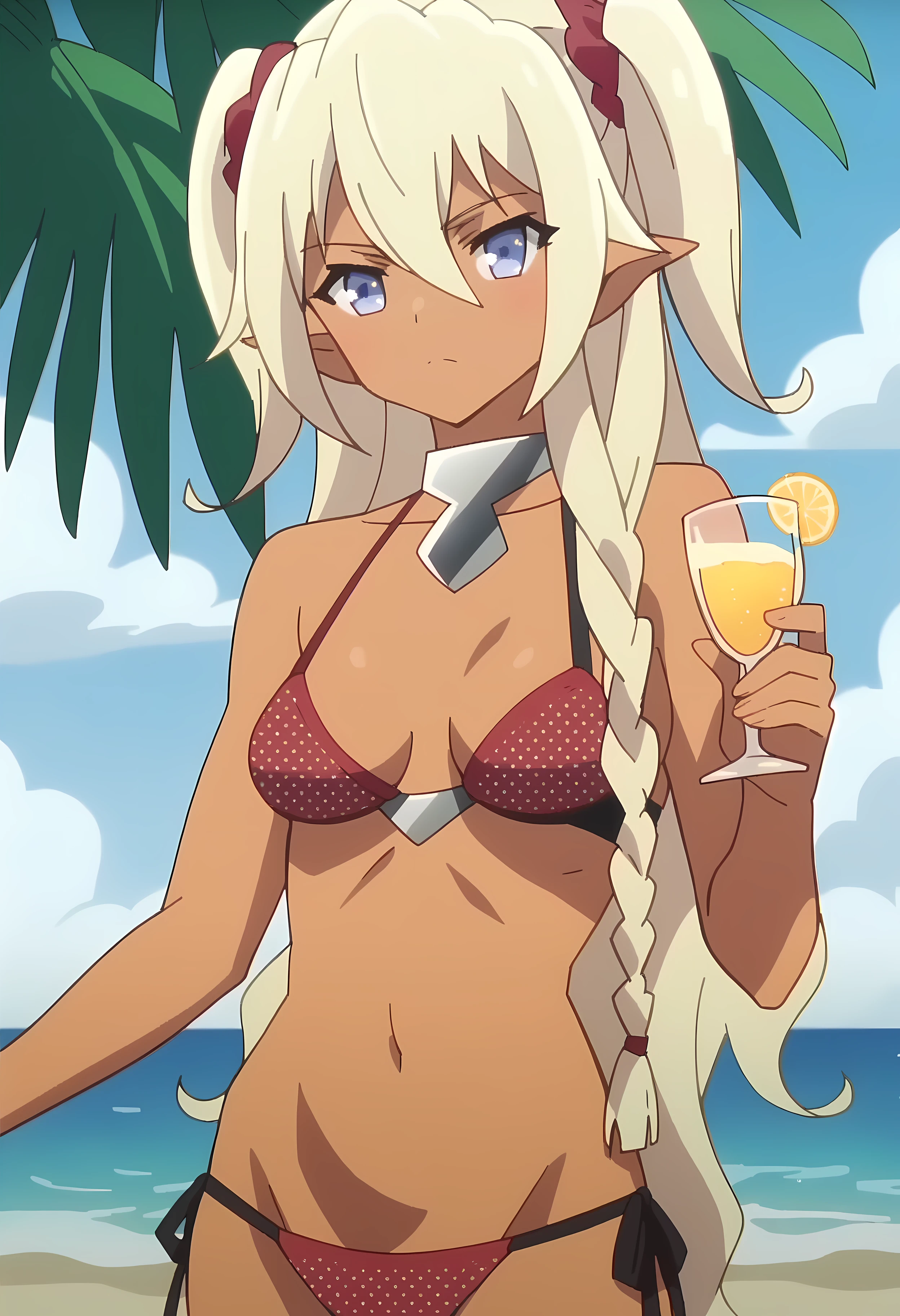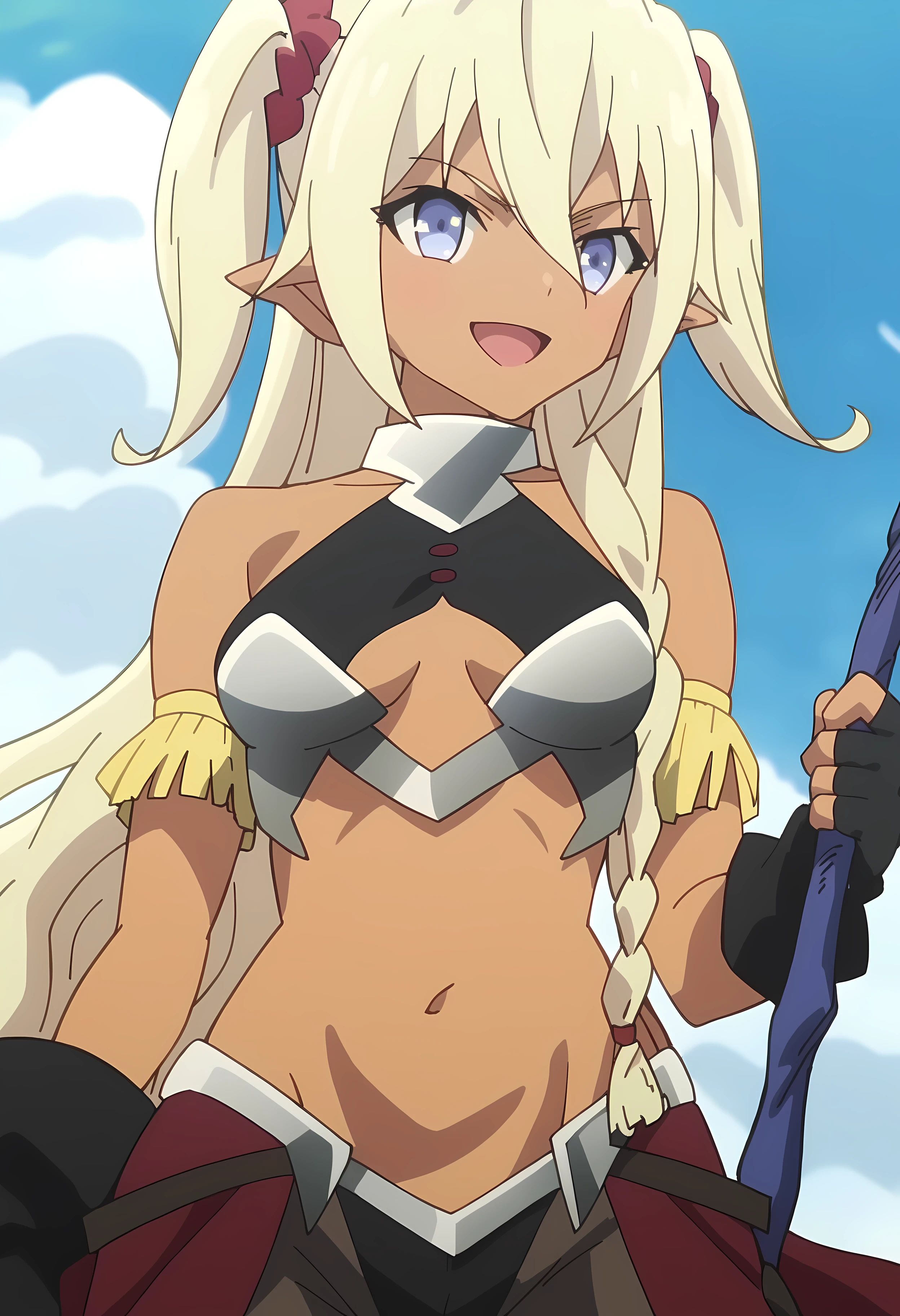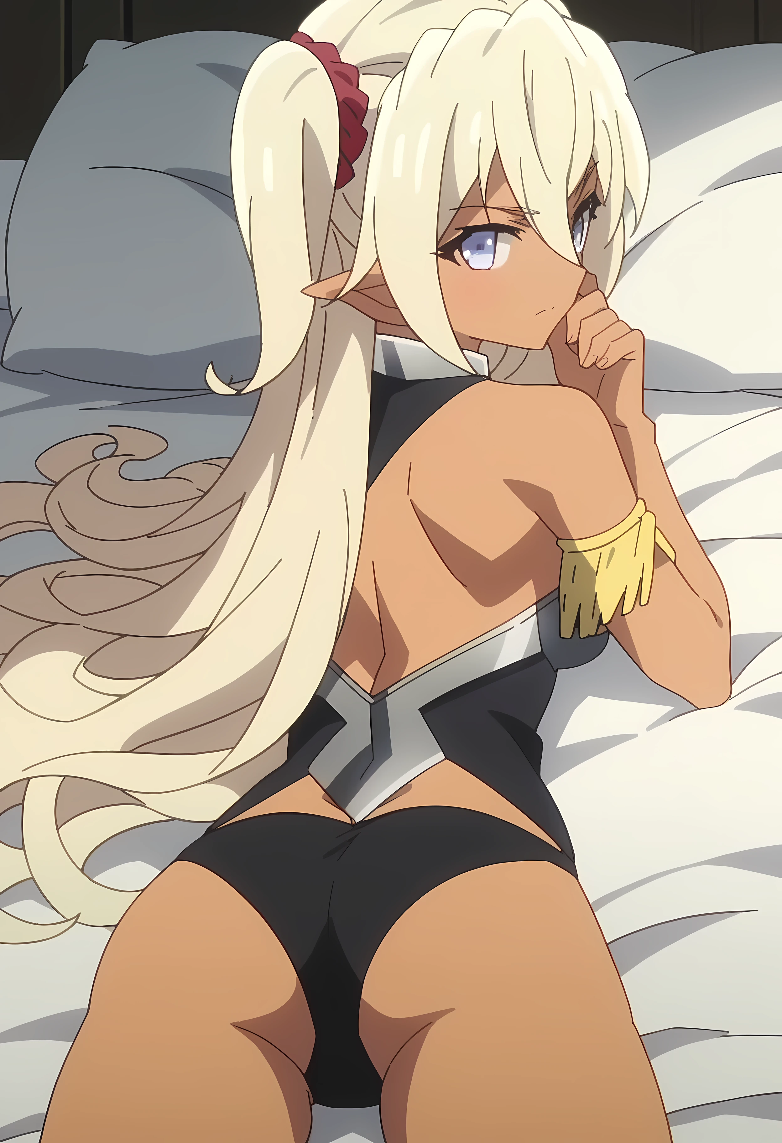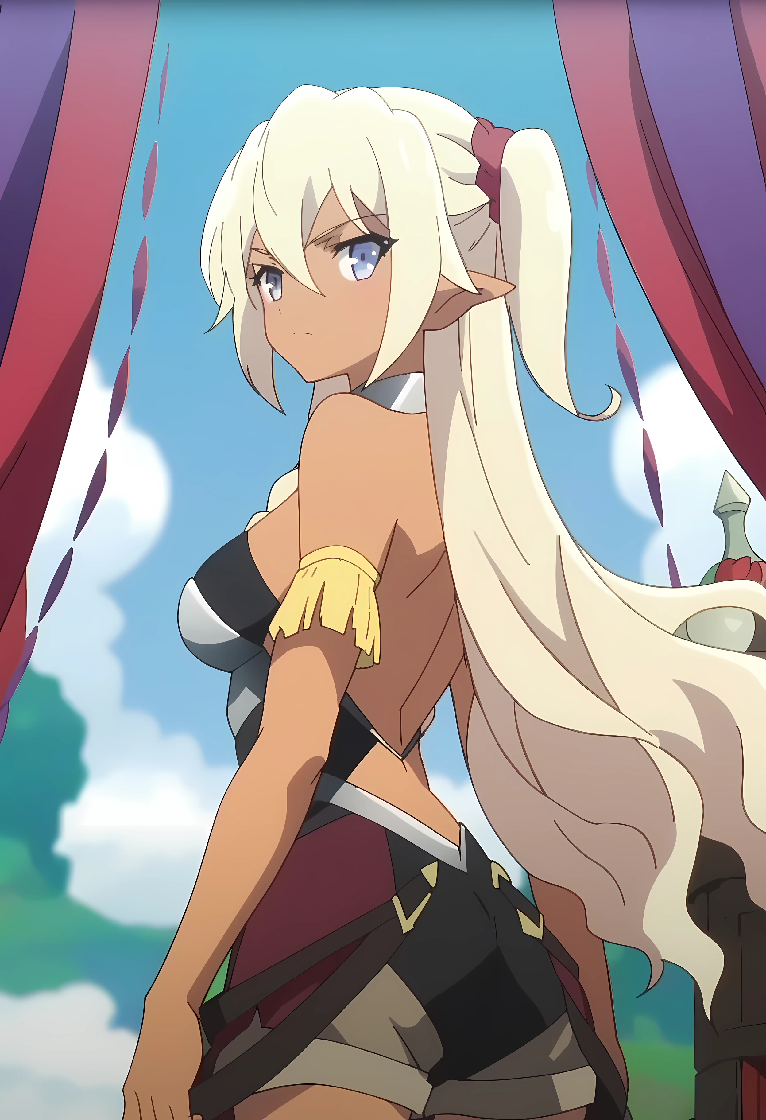 Edelgard, 1girl, dark skin, elf ears, blue eyes, blonde hair, long hair, twintails, braid, red hairband,