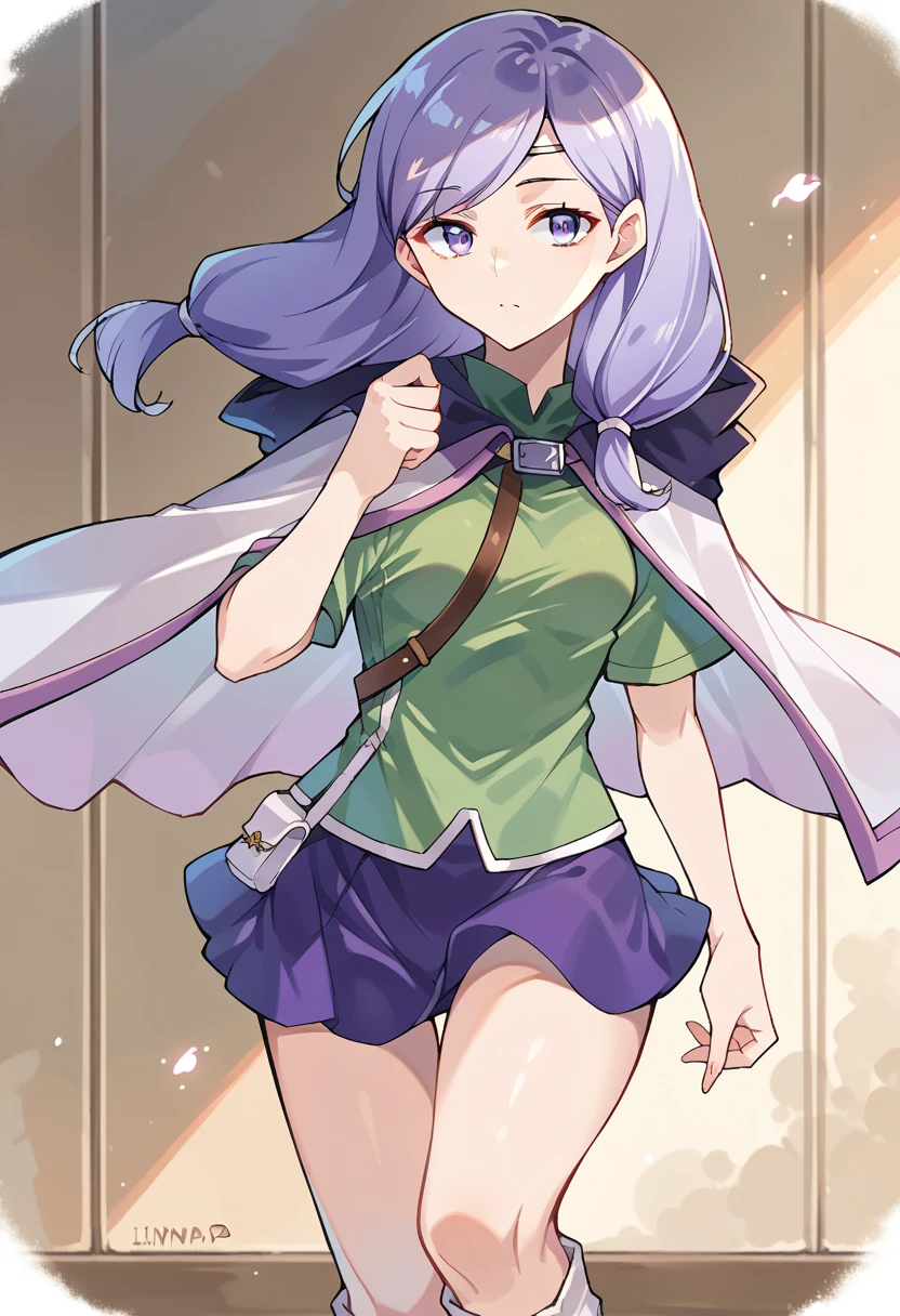 ilyanaPoR, lavender hair, bangs, lavender eyes, circlet, purple skirt, green shirt, short sleeves, pink capelet, white footwear, knee boots