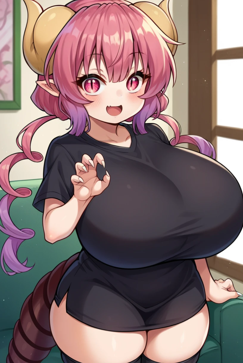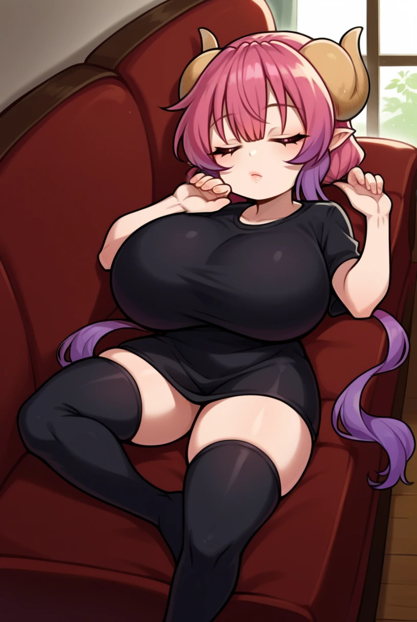 Outfit 1: [Default: "Ilulu_Default, thighhighs, black shirt, short sleeves, shortstack, black skirt, short dress"]