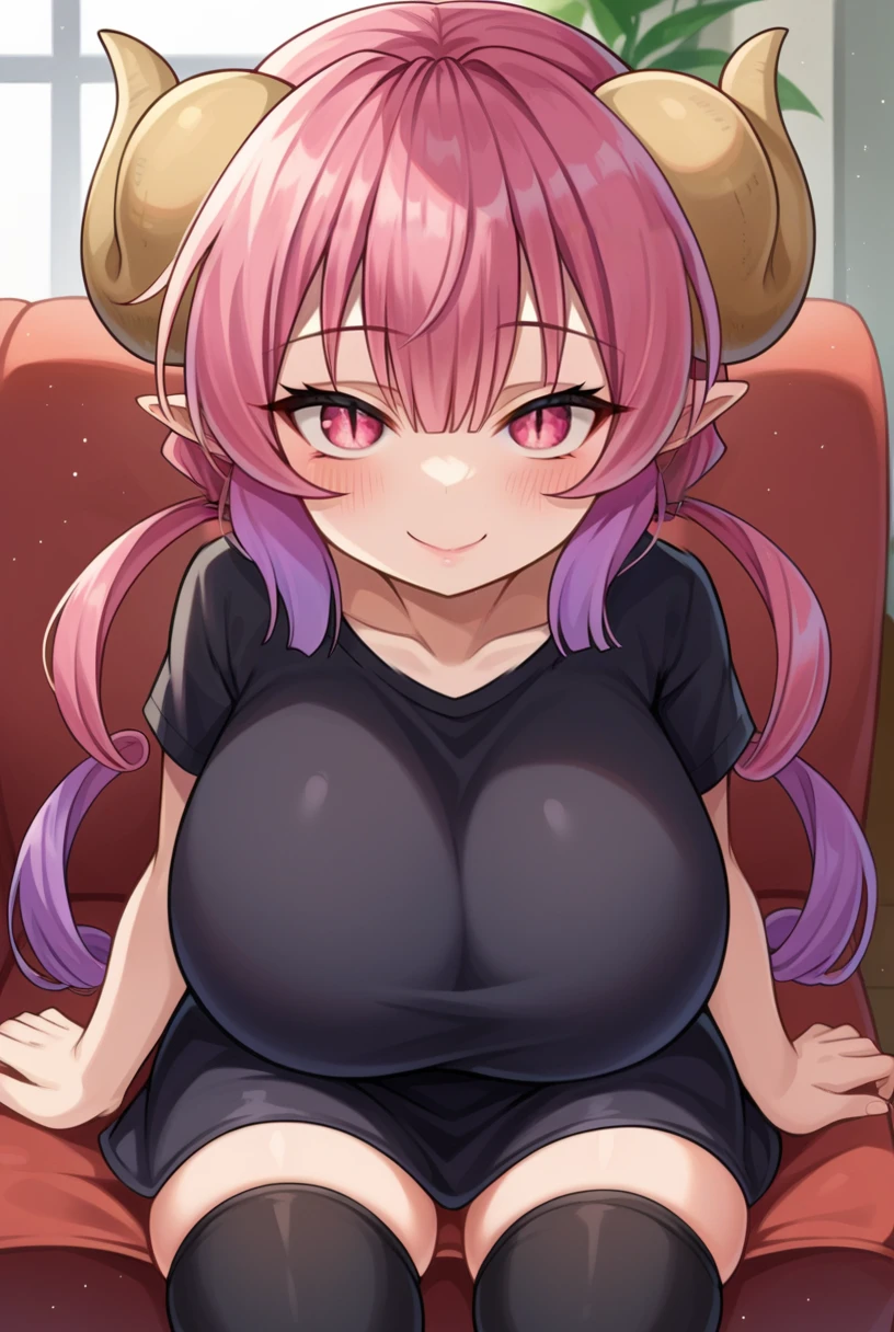 pink eyes, gradient hair, purple hair, pink hair, multicolored hair, short hair with long locks, twin drills, low twintails, sidelocks, hair between eyes, dragon horns, curled horns, pointy ears,