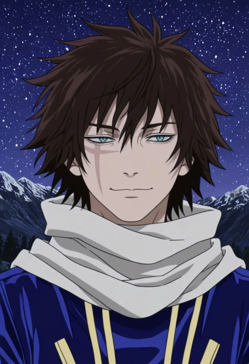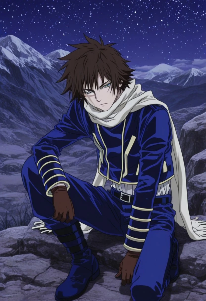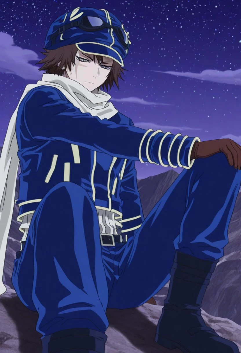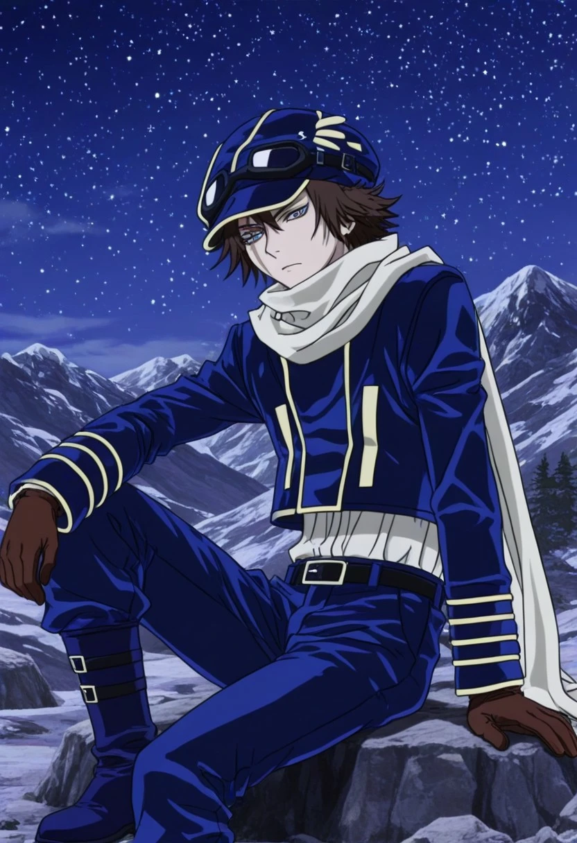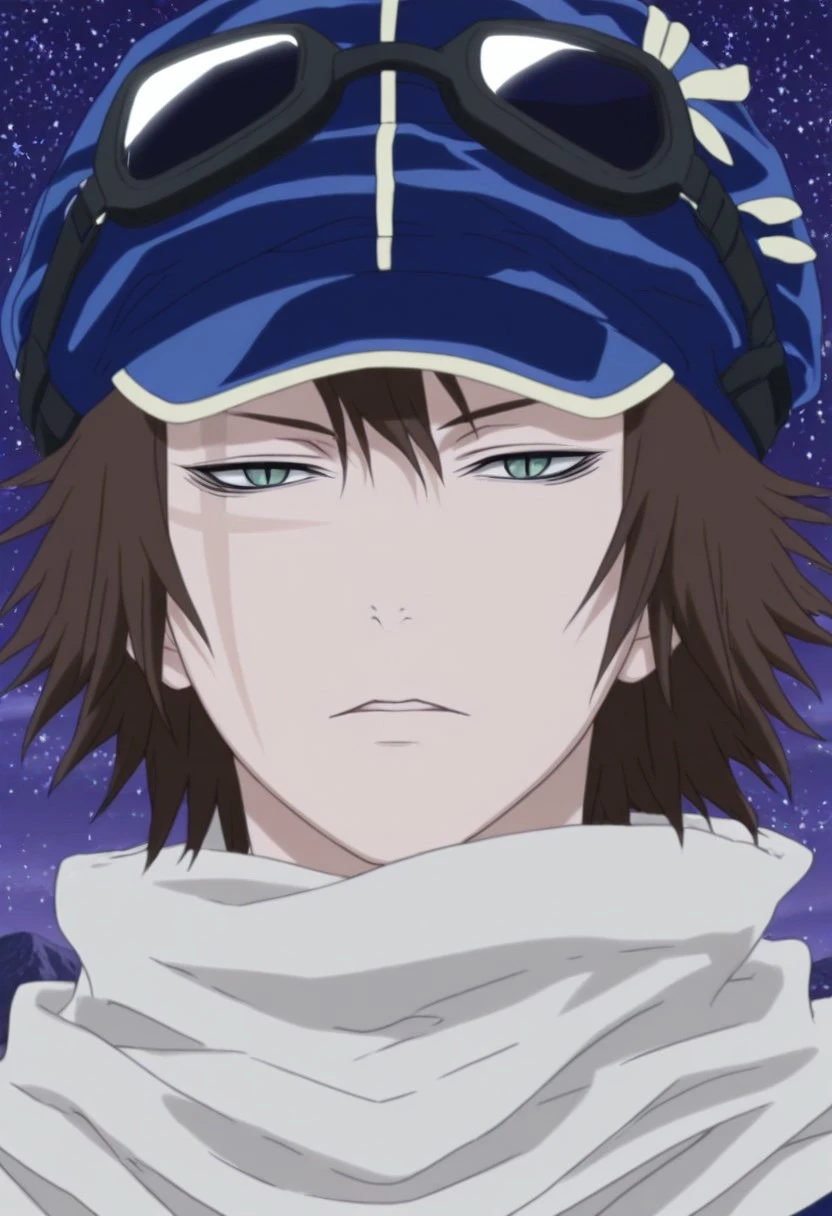 Jiggy Pepper, brown-black hair, turquoise eyes, slit pupils, single eye scar, blue beret hat, goggles, long white scarf, blue cropped jacket, yellow accents, white undershirt, brown gloves, black belt, blue pants, dark blue boots