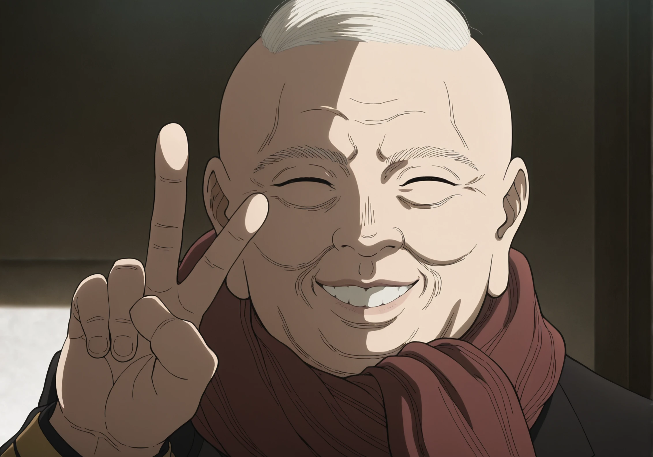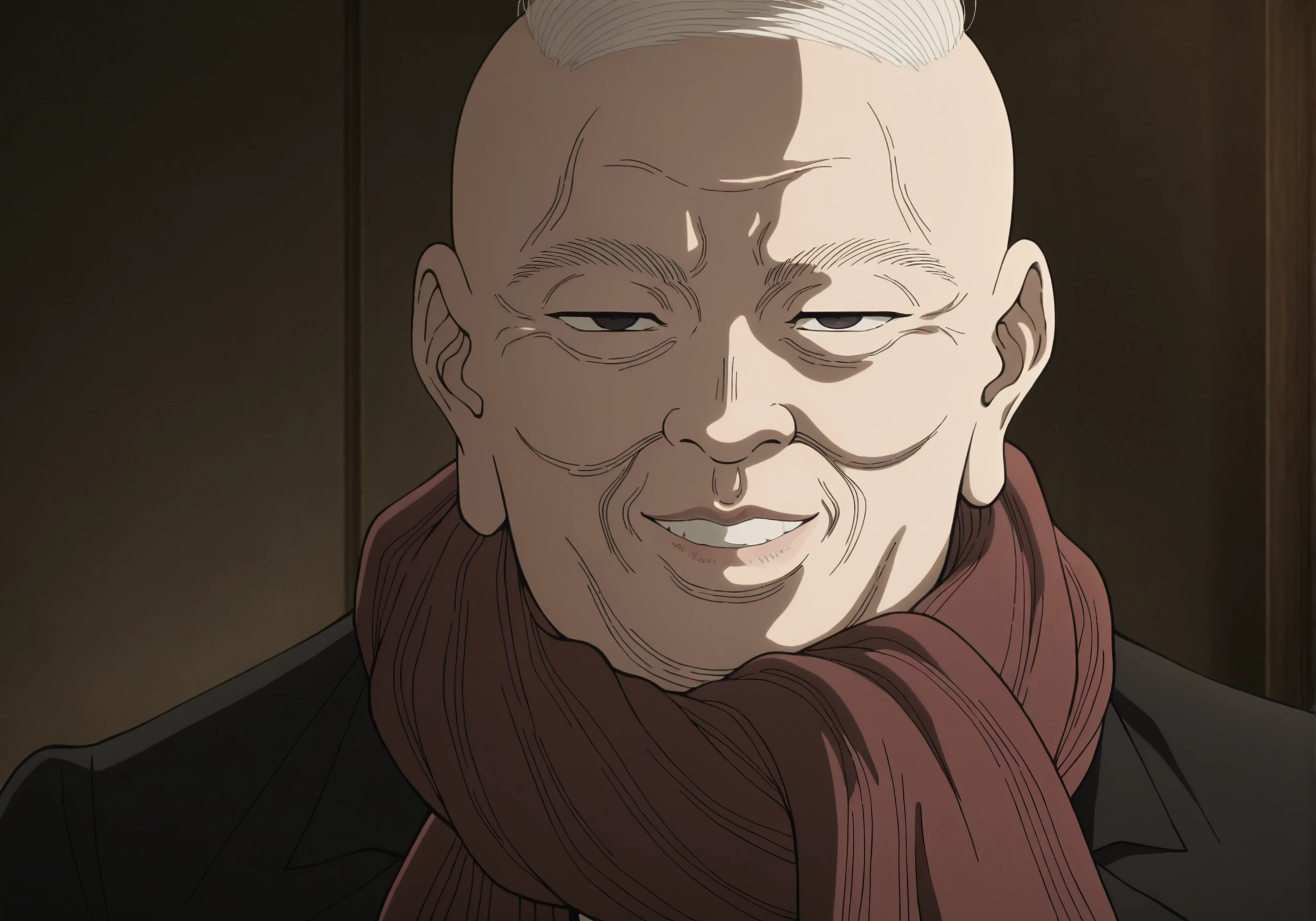 1old man, balding, white combed hair, wrinkled face, narrow eyes, grin, black uniform, gold trim, scarf, black pants, black shoes