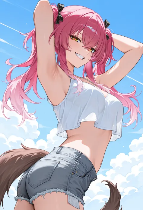 Recommended Appearance Tags:strylup4, yellow eyes, red pupils, slit pupils, pink hair, sidelocks, hair between eyes, hair intakes, gradient hair, twintails, long hair, large breasts, brown tail, hair ribbon, black ribbon