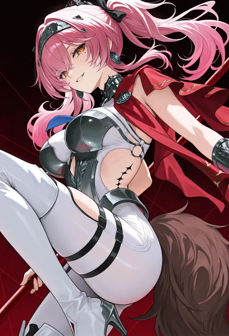 Appearance: strylup4, yellow eyes, red pupils, slit pupils, pink hair, sidelocks, hair between eyes, hair intakes, gradient hair, twintails, long hair, large breasts, brown tail, hair ribbon, black ribbon