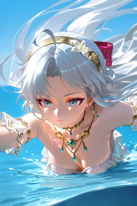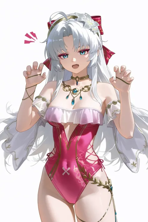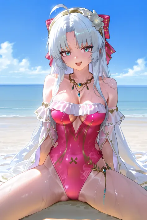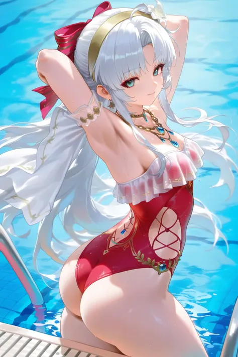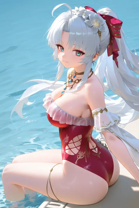 🔹 Recommended Tags:carlotta (splashing summer) (wuthering waves), 1girl, white hair, green eyes, red one-piece swimsuit, one-piece swimsuit, swimsuit, solo, long hair, very long hair, bare shoulders, ahoge, necklace, bracelet, jewelry, hair flower, hair ornament, hair bow, white flower, parted bangs, cleavage, frills, bow