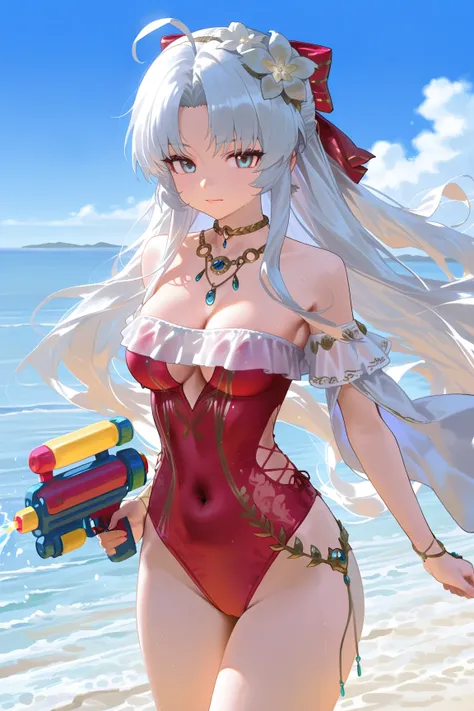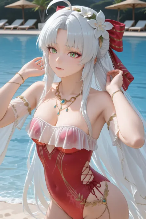 carlotta \(splashing summer\) \(wuthering waves\), 1girl, white hair, green eyes, red one-piece swimsuit, one-piece swimsuit, long hair, solo, swimsuit, hair flower, hair ornament, jewelry, ahoge, necklace, hair bow, bare shoulders, bow, frills, cleavage, white flower, parted bangs, very long hair, bracelet