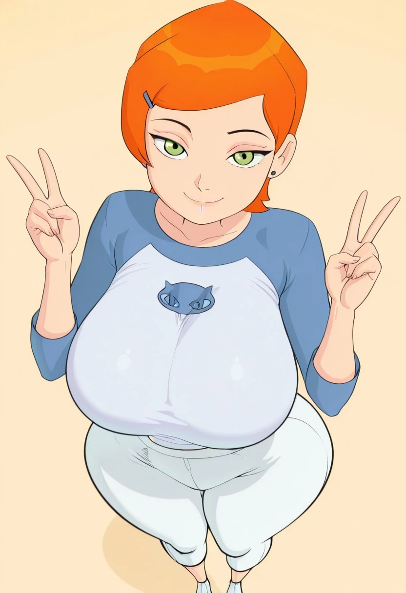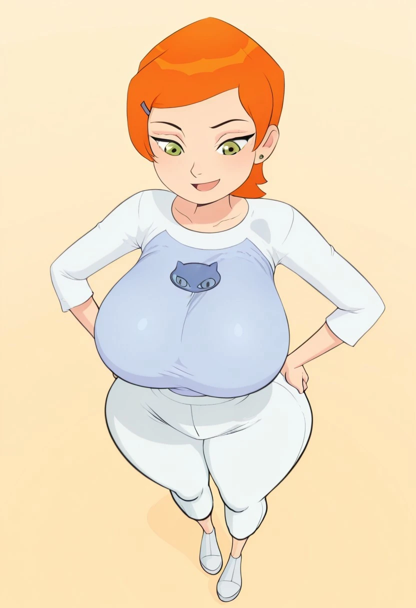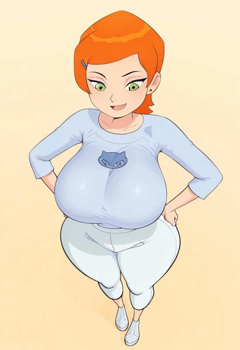GwendolynT, orange hair, short hair, green eyes, hairclip, huge breasts, wide hips