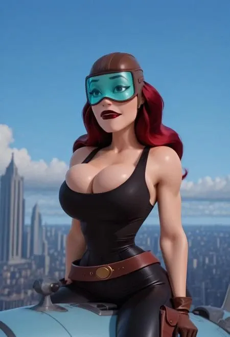 RS0TXTANE, 1girl, solo, dark red hair, long hair, brown aviator cap, turquoise-tinted goggles, dark red lipstick, brown aviator jacket with white fur collar, jacket, black tank top, black pants, belt, holster, brown gloves, brown boots.