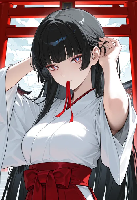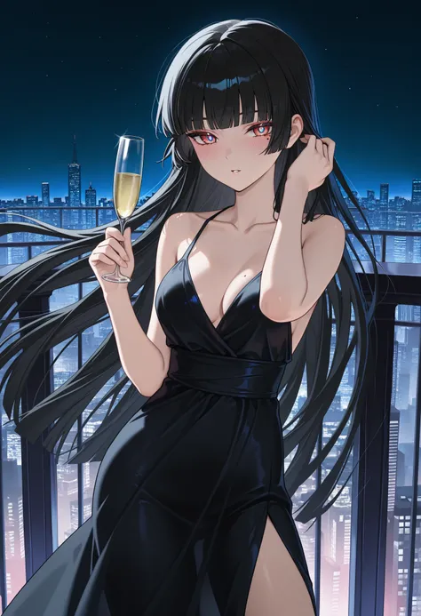strychsa, hime cut, black hair, very long hair, multicolored eyes, red eyes, blue pupils, white pupils, mole under eye, medium breasts