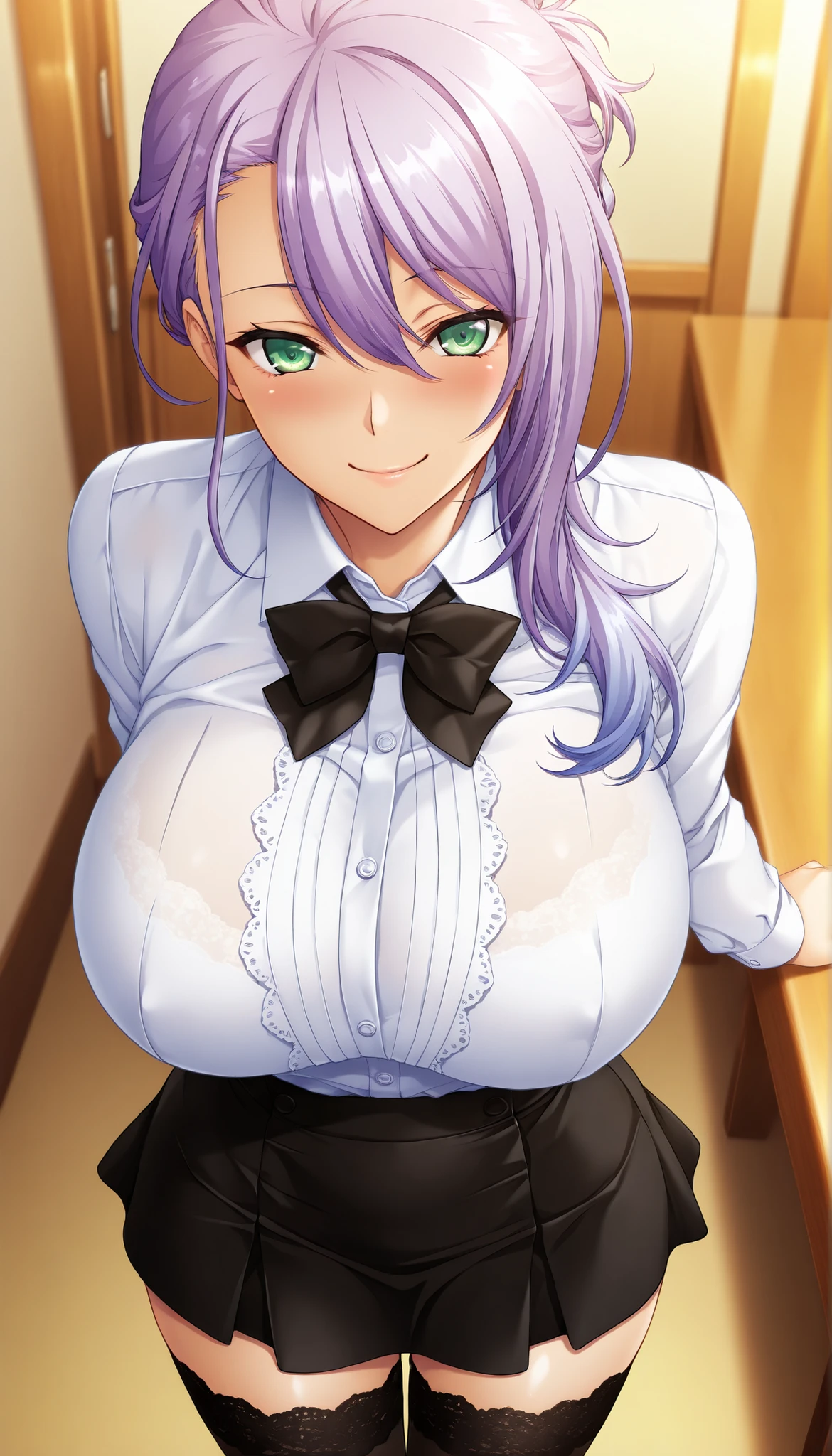Okina Mishio, black hair, white bow, ponytail, violet eyes