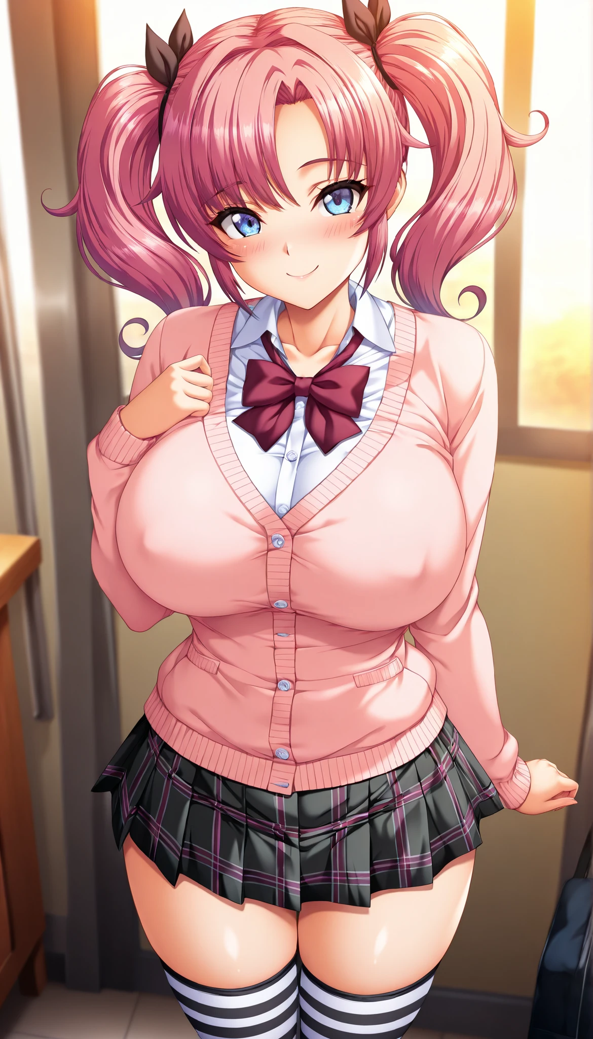 Niijima Neiro, pink hair, twintails, twintails with black bows, blue eyes