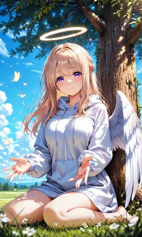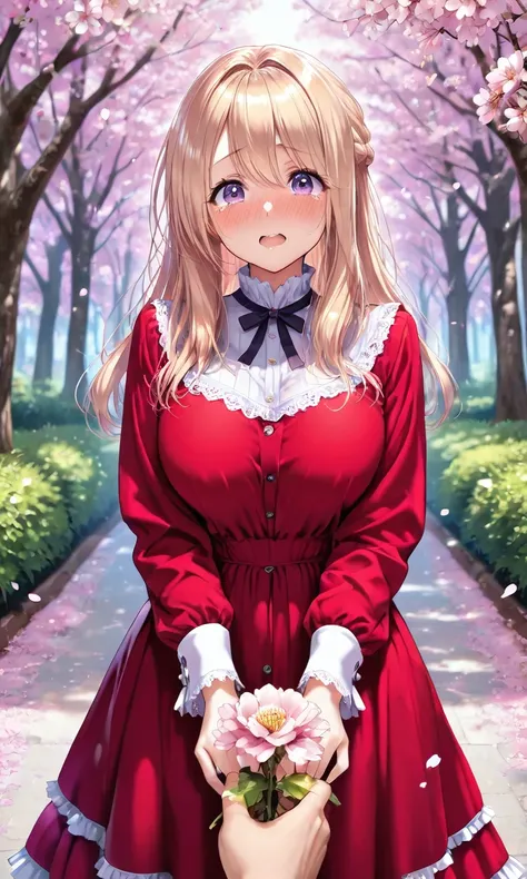 purple eyes, high gradient eyes, wide waist, huge breasts, sagging_breasts, blonde_and_yellow hair, long hair, multicolored hair, gradient hair, black pantyhose, pleated_skirt, brown skirt, green necktie, pink sweater, school_uniform