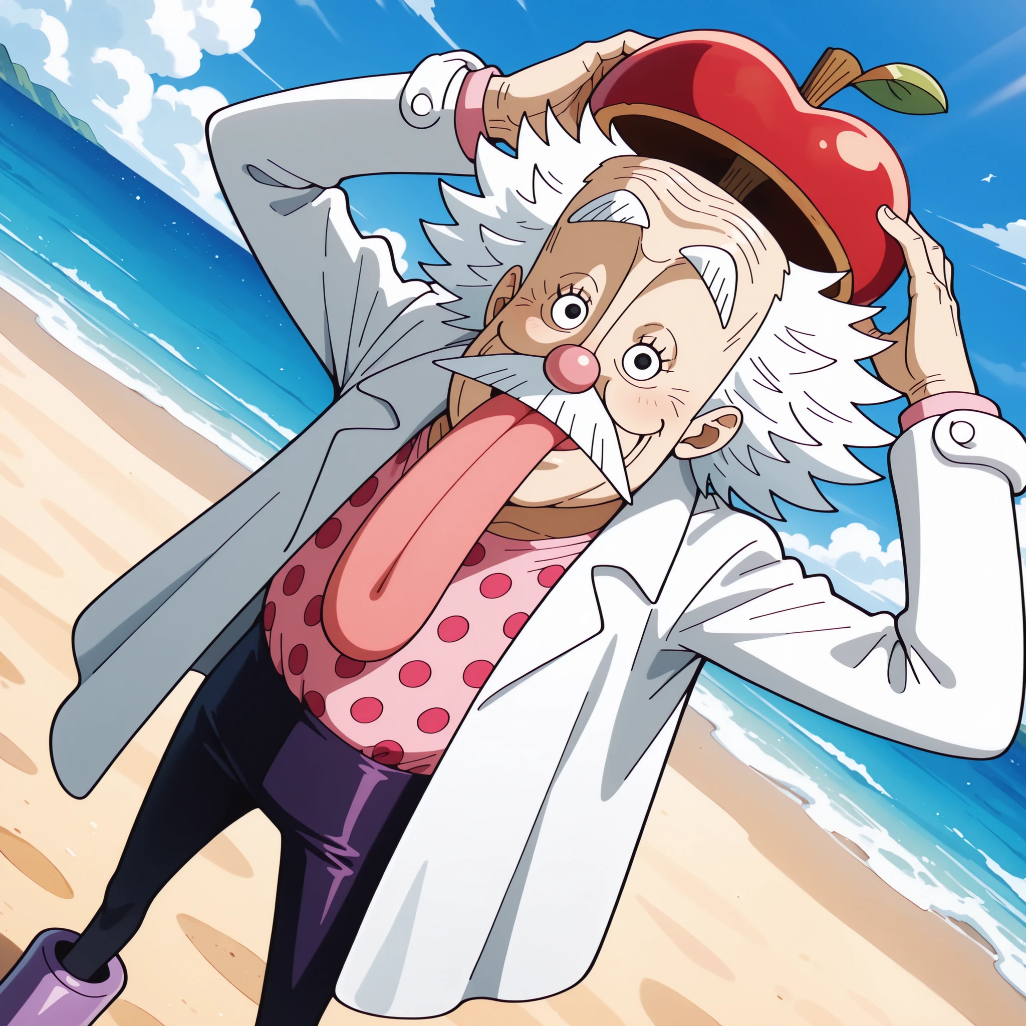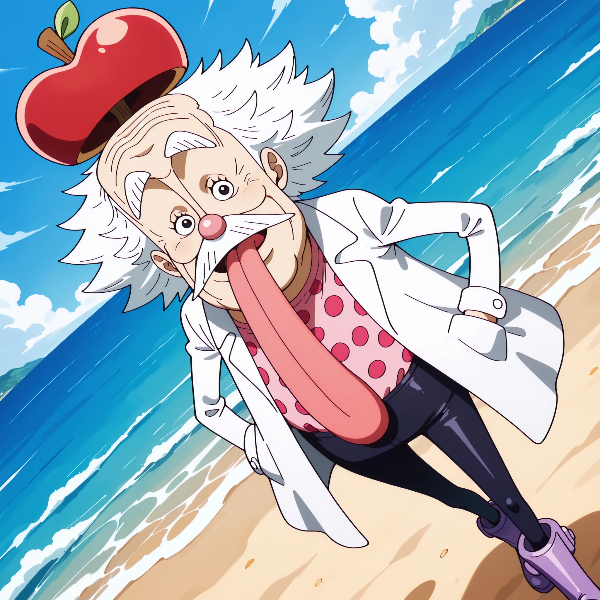dr. vegapunk, black eyes, white hair, spiky hair, mustache, long tongue, tongue out, apple hat, labcoat, polka dot shirt, pants, purple boots