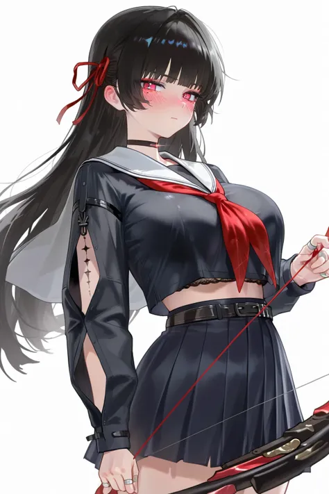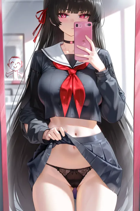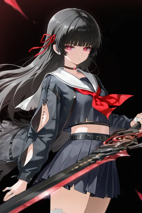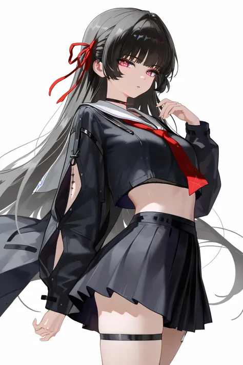 chisa \(wuthering waves\), red ribbon, red eyes, black hair, 1girl, solo, long hair, skirt, navel, school uniform, socks, pleated skirt, serafuku, white socks, looking at viewer, sailor collar, midriff, black skirt, thigh strap, neckerchief, thighs, shirt, crop top, long sleeves