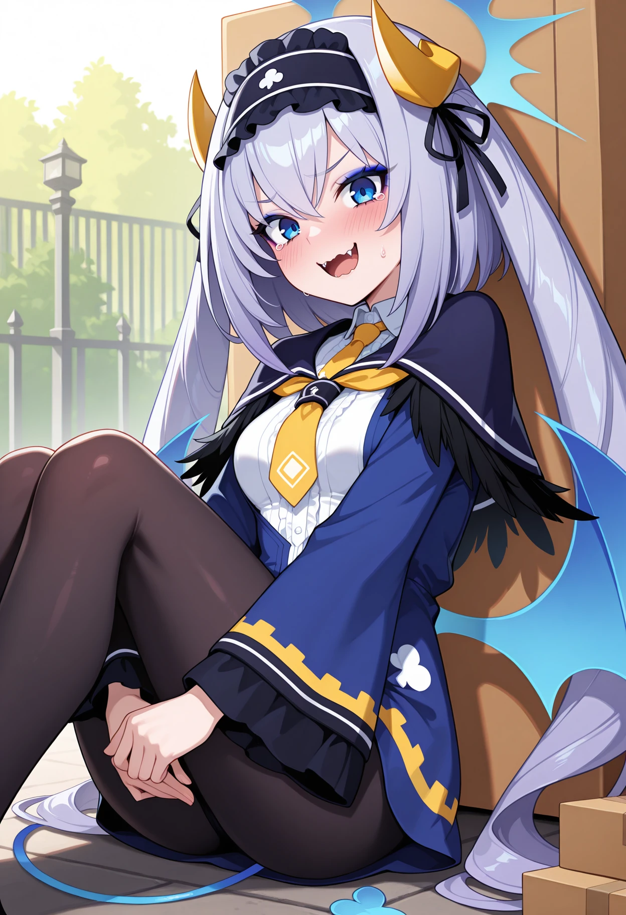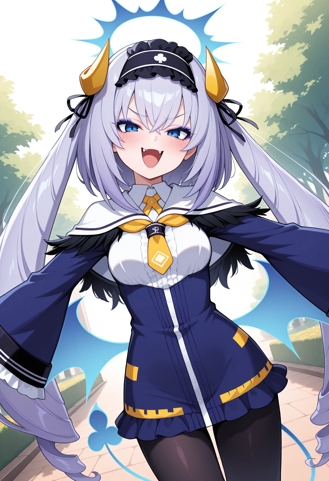 frilled hairband, drils, horns, hair ribbon, blue dress, white shirt, capelet, feathered cape, neckerchief, yellow necktie, wide sleeves, blue sleeves, black trim, short dress, black pantyhose,