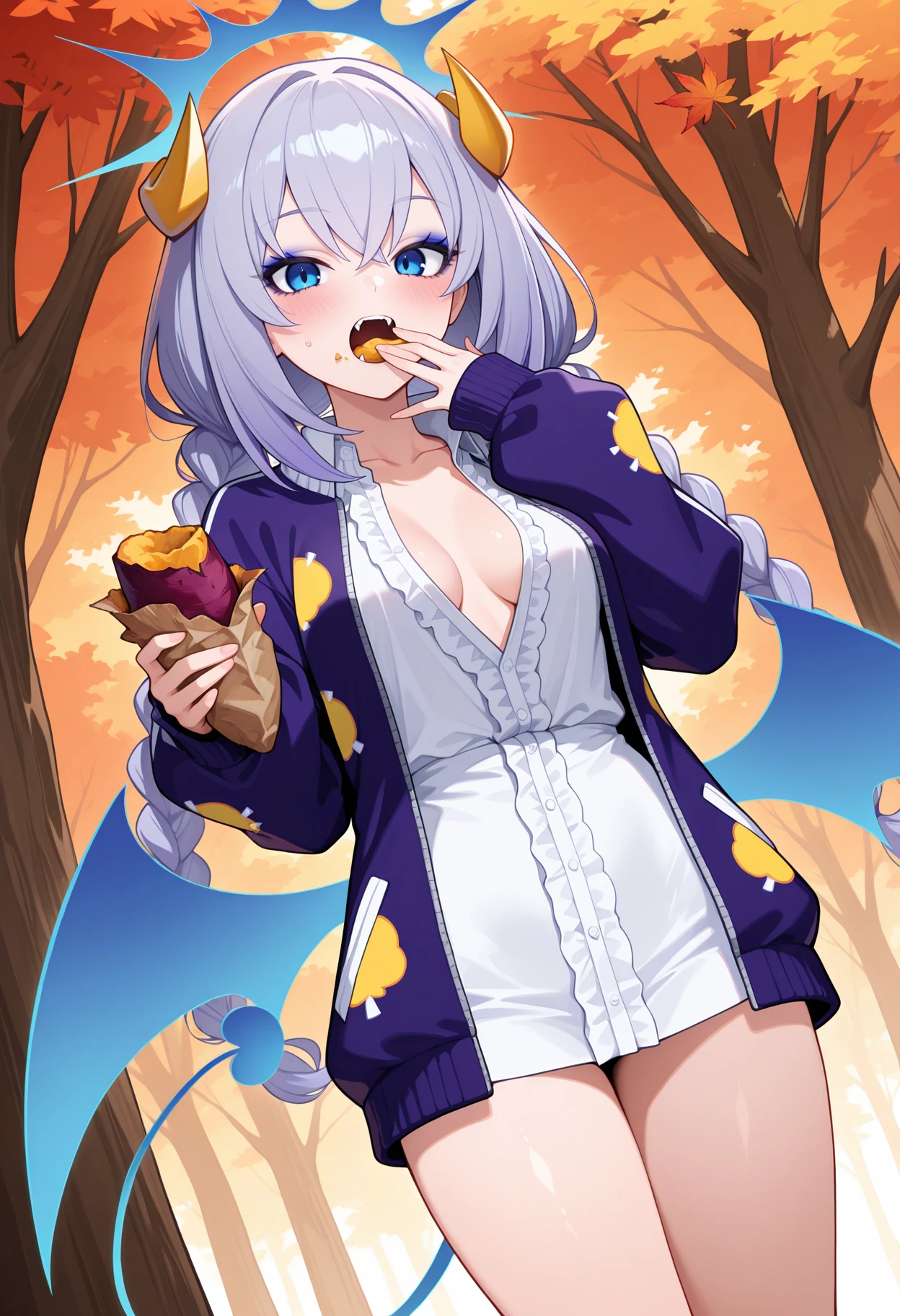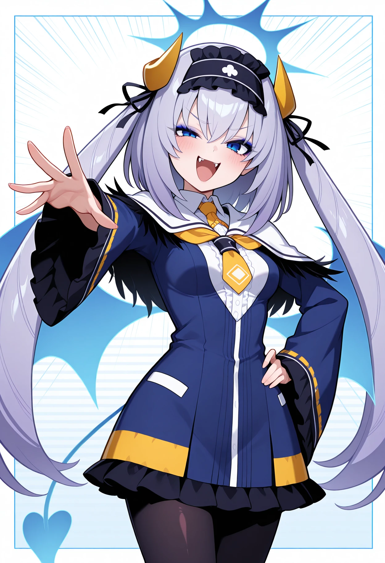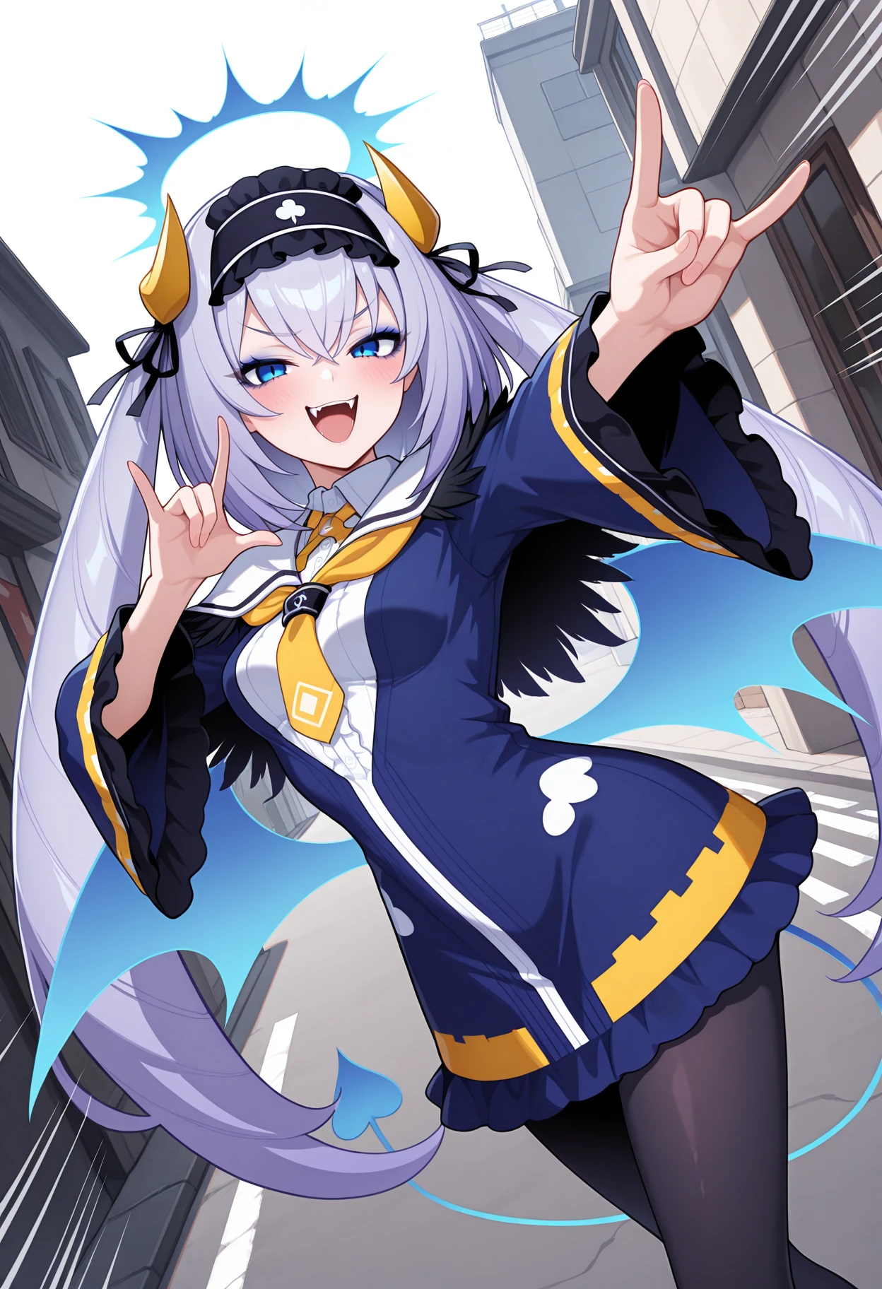 kmfgank, very long hair, grey hair, purple hair, twintails, blue eyes, eyeshadow, eyelashes, wings, demon horns, demon tail, halo, fangs, small breasts, medium breasts,