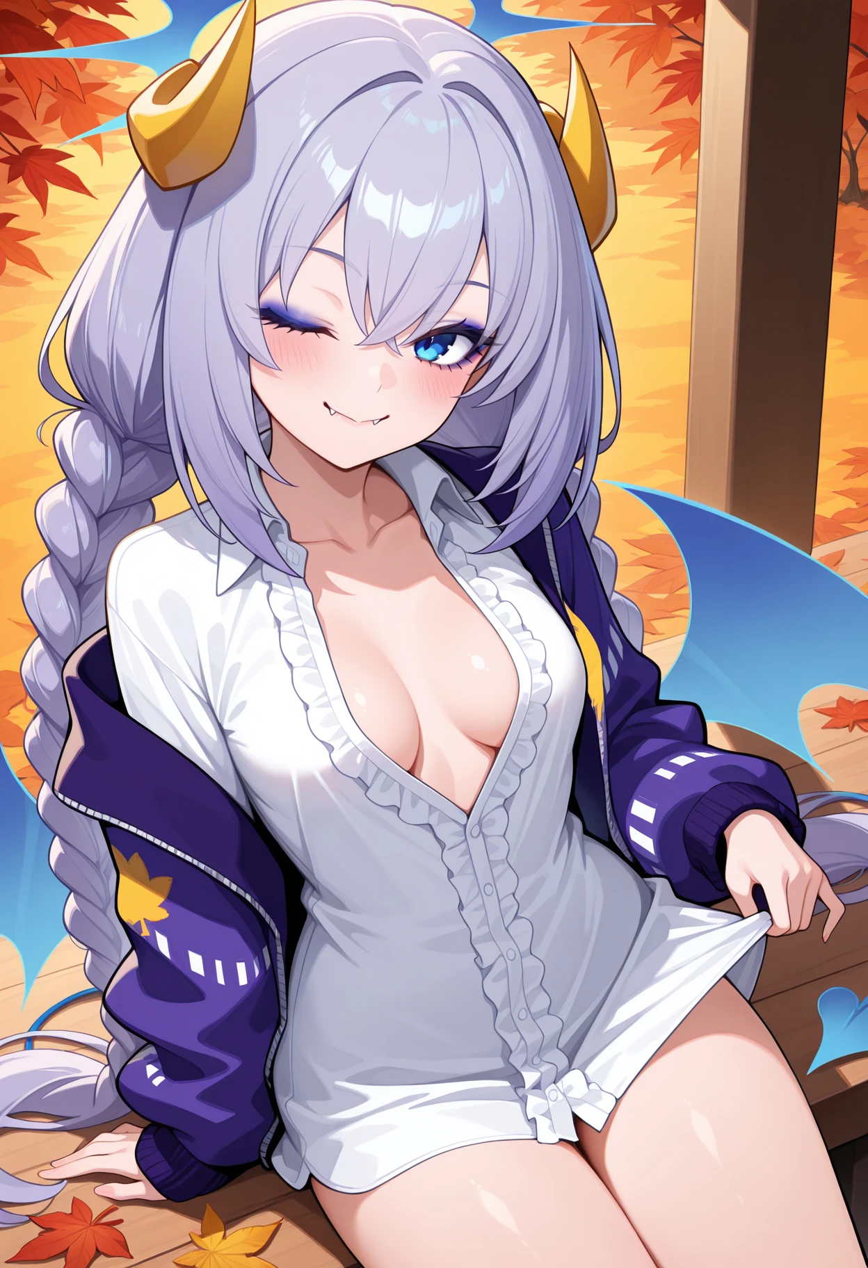 print jacket, braids, indigo jacket, collarbone, open jacket, white shirt, center frills, thighs,