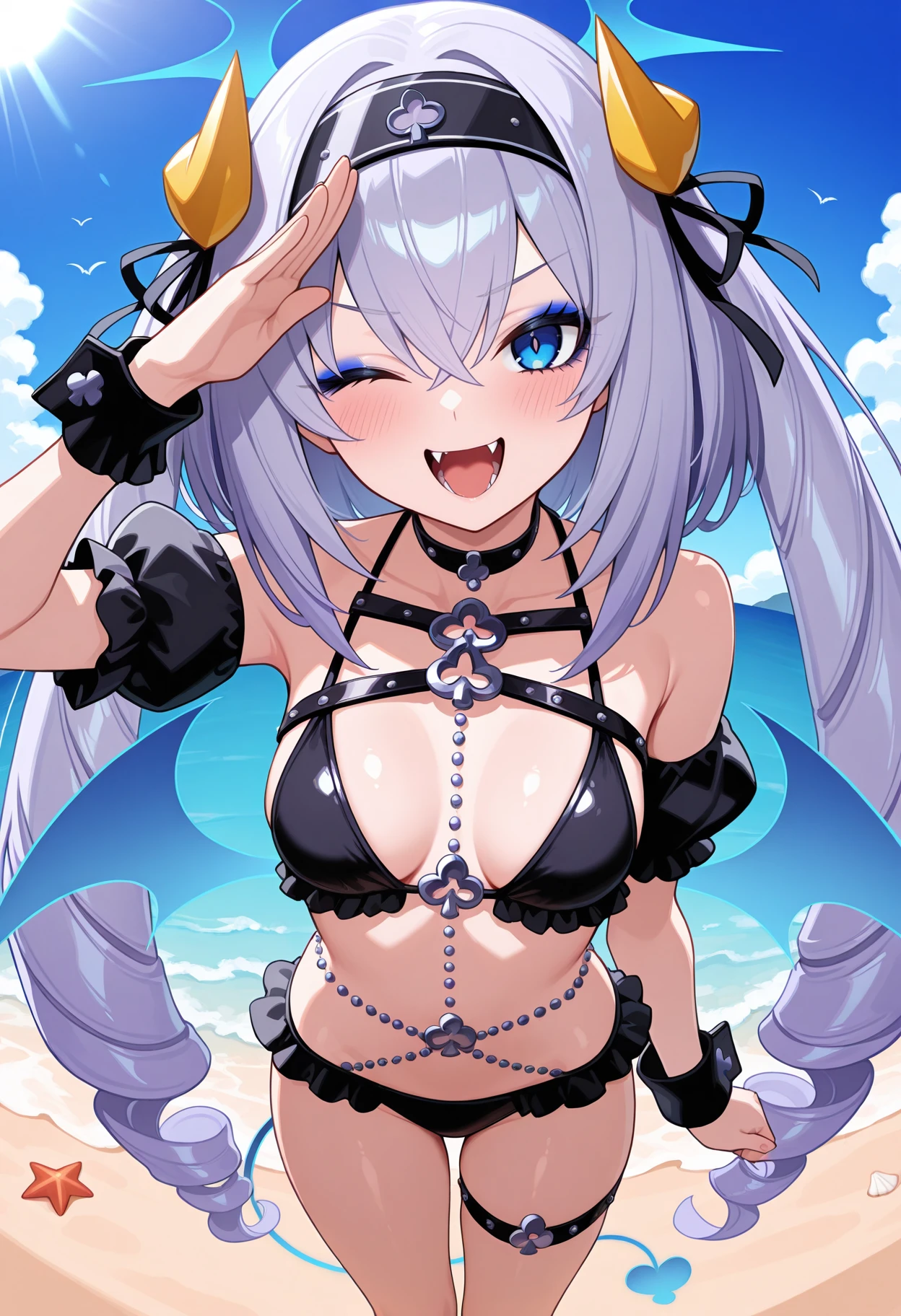 black bikini, black hairband, drills, hair ribbon, club \(shape\), choker, crossed belts, chest belt, puffy short sleeves, jewelry, frilled bikini, wrist cuffs, thigh strap,