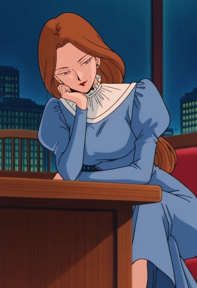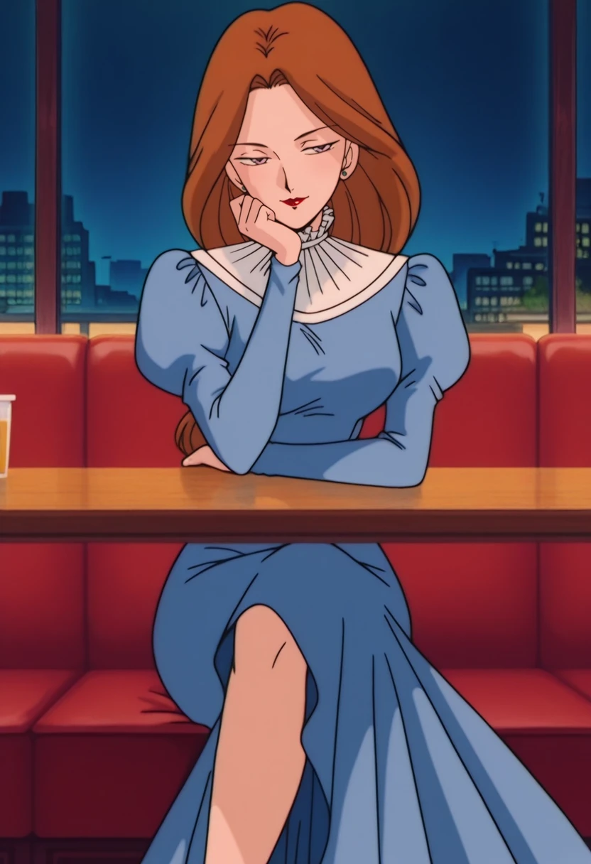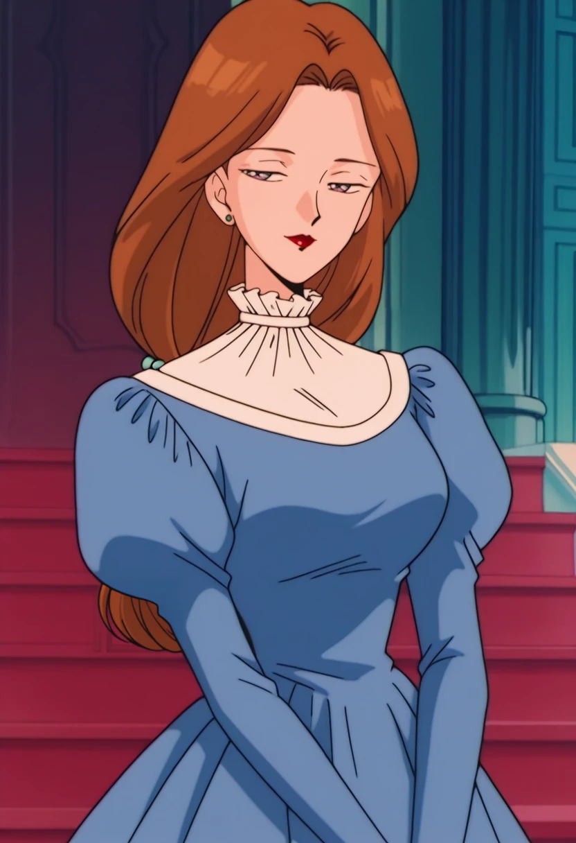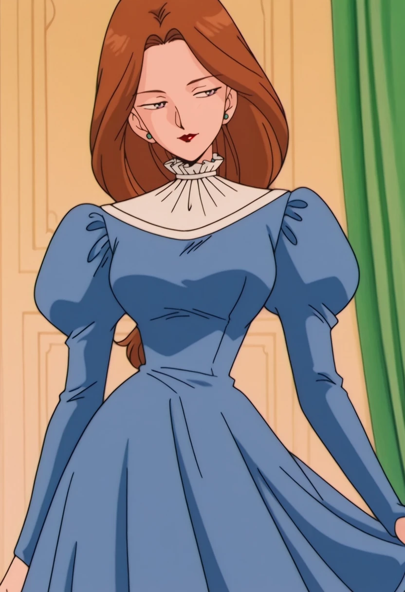 CountessRose, 1girl, solo, dress, brown hair, blue dress, long hair, long sleeves, jewelry, earrings, puffy sleeves, juliet sleeves, long dress, breasts, large breast, frilled collar, frills, puffy longs leeves, collar, lipstick, makeup, purple eyes, red lips, lips, mature female, green stud earrings, frilled shirt collar, low-tied long hair, hair bobbles, blue shoes, high heels,Countess Rose Youma