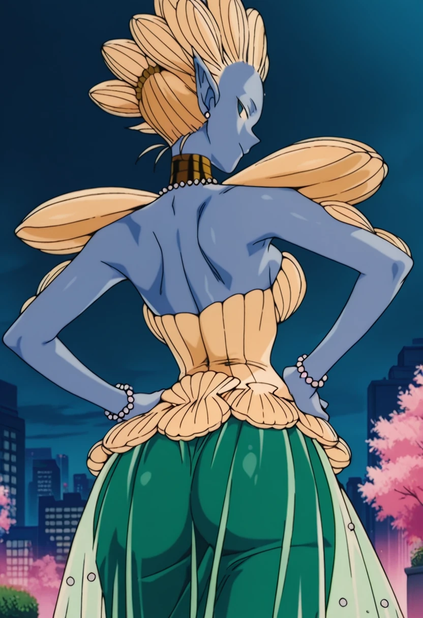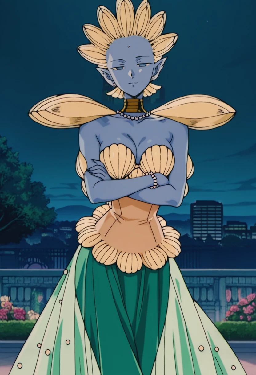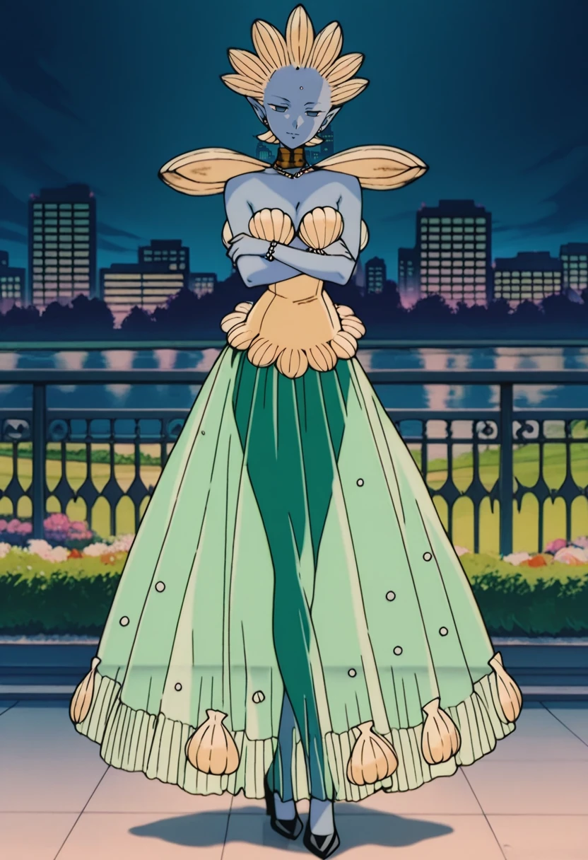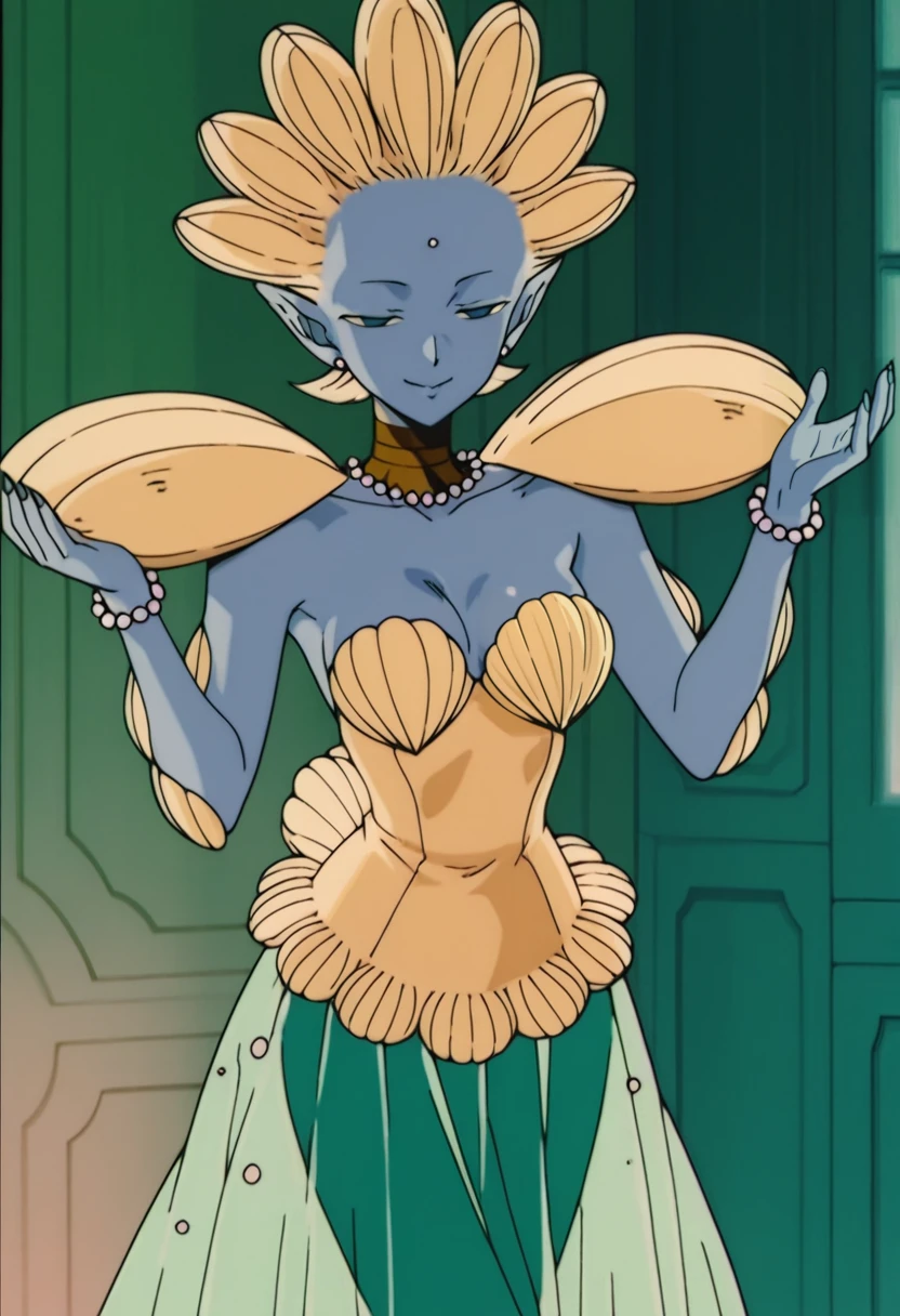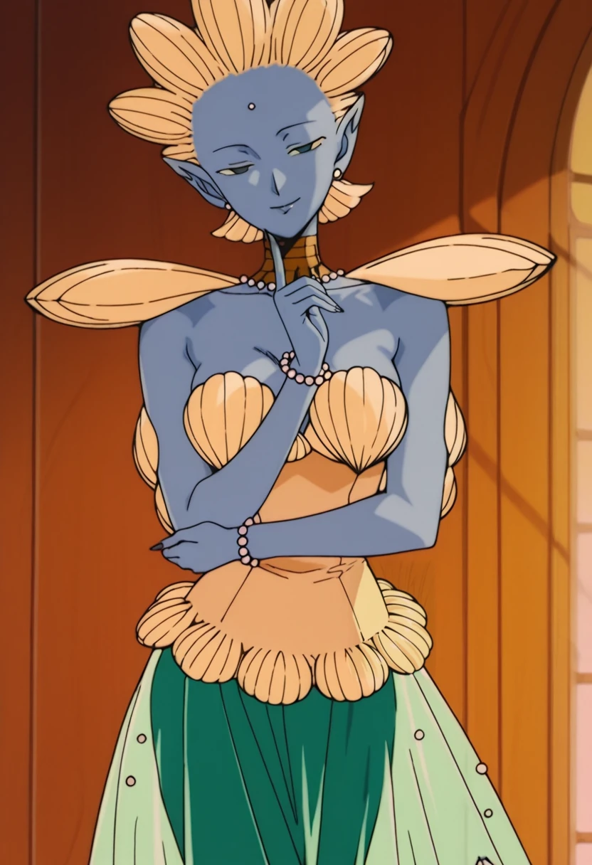 Shakoukai, 1girl, solo, monster girl, blue skin, colored skin, forehead pearl, blue eyes, no pupils, pointy ears, jewelry, choker, necklace, pearl necklace, breasts, large breast, shell, shells on arms, shell in hand, shell shoulder pads, strapless, strapless dress, shell bra, shell bikini top, hair made of shells, pearl earrings, dress, finger nails, long finger nails, shells on dress, shells on back, pearl bead bracelet, jewelry, translucent green skirt, shells on skirt, pearls on skirt, black footwear, high heels, black shoes, Artistic Disclaimer: