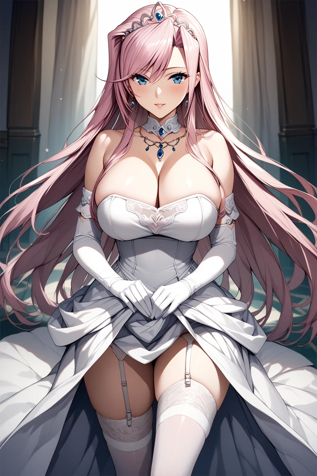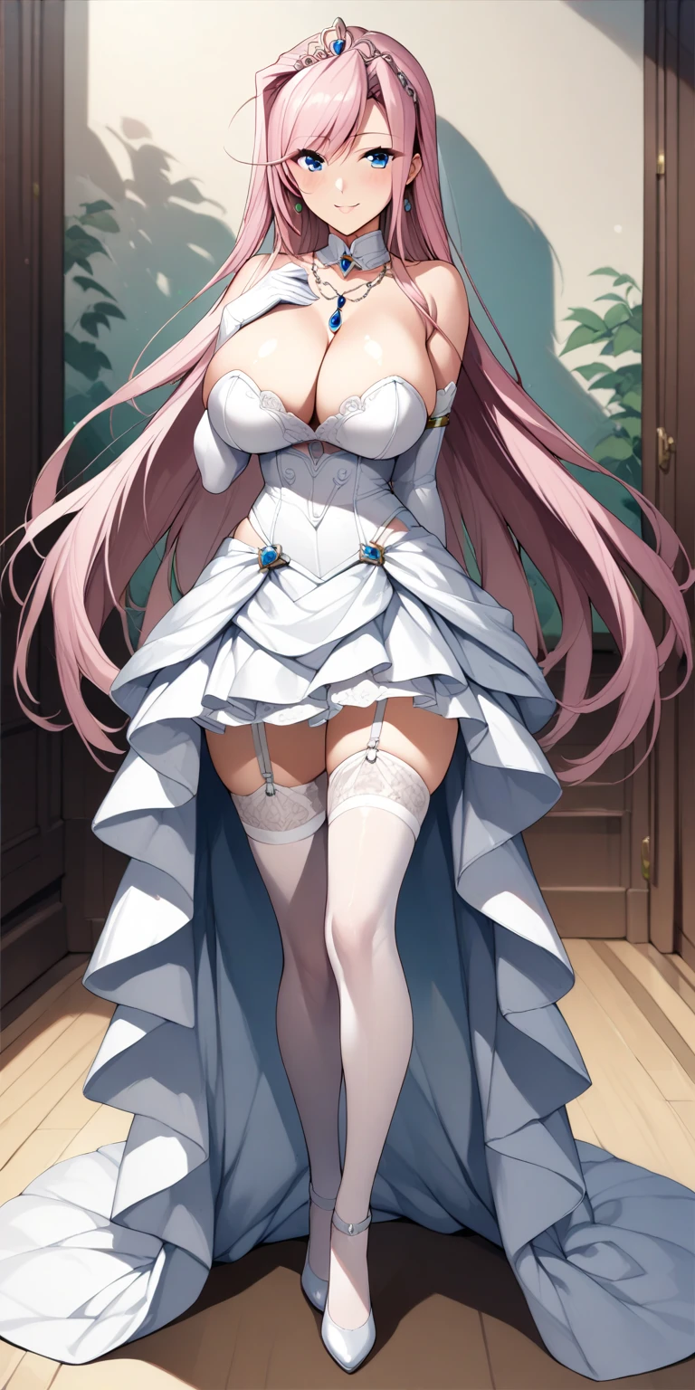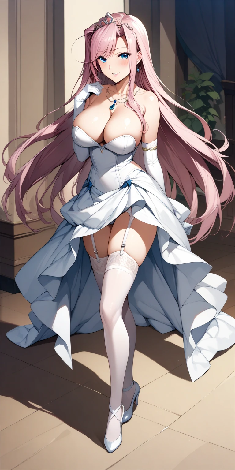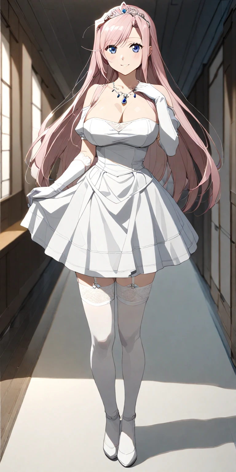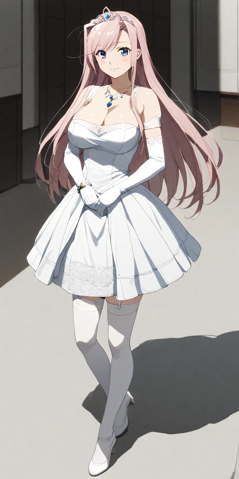 2. White Dress - "thighhighs, cleavage, long hair, dress, gloves, elbow gloves, jewelry, white thighhighs, necklace, garter straps, tiara, white heels, "