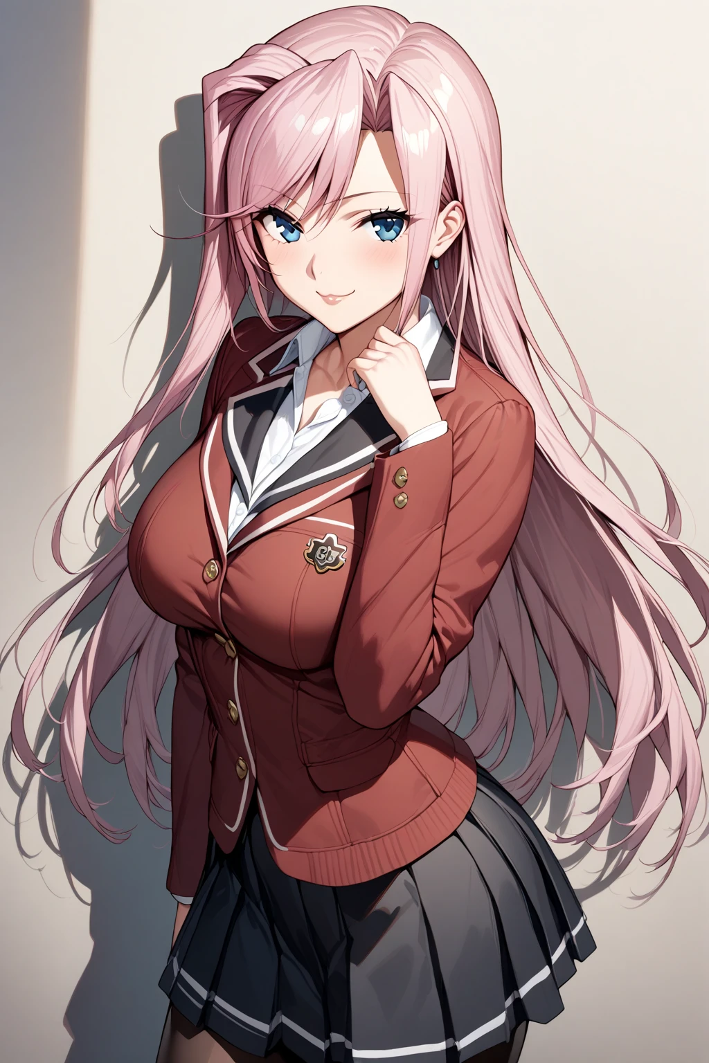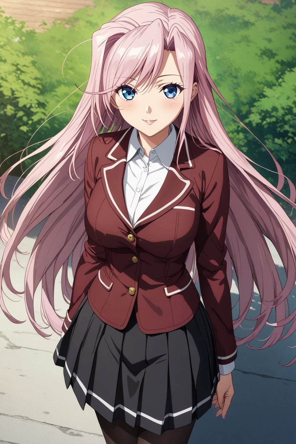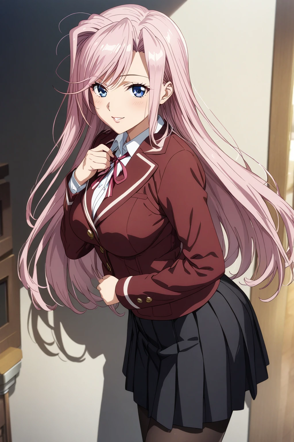 1. School uniform - "school uniform, white shirt, red jacket, black skirt, black pantyhose, brown shoes,"