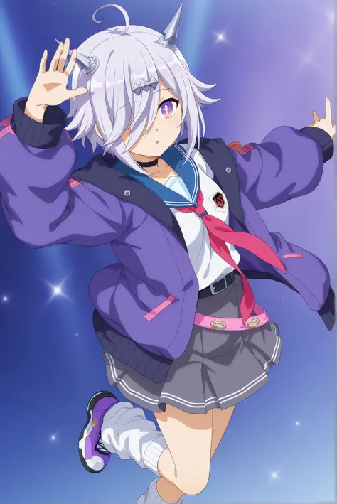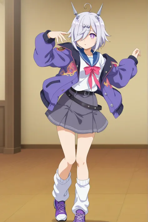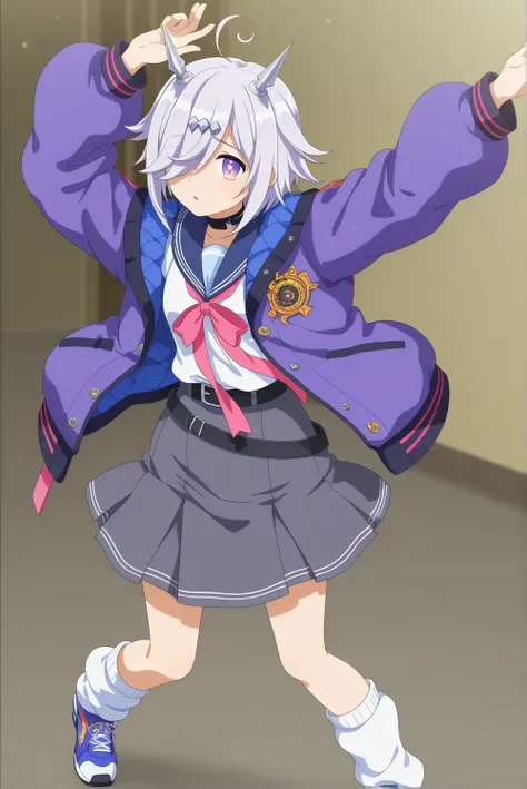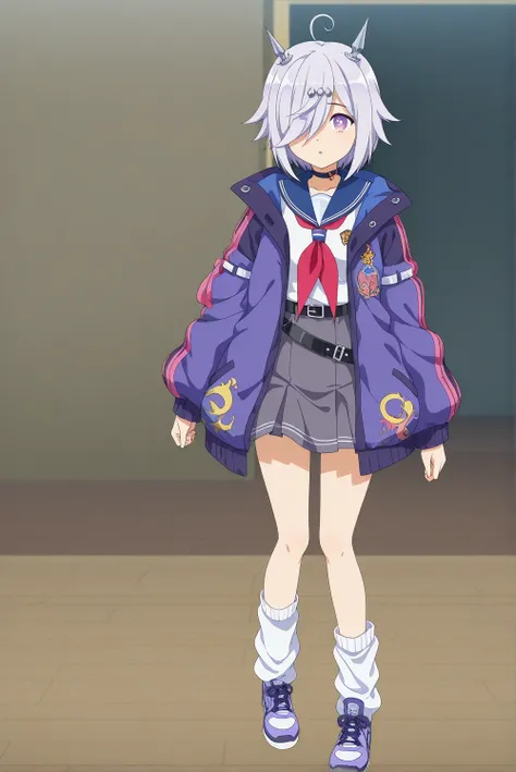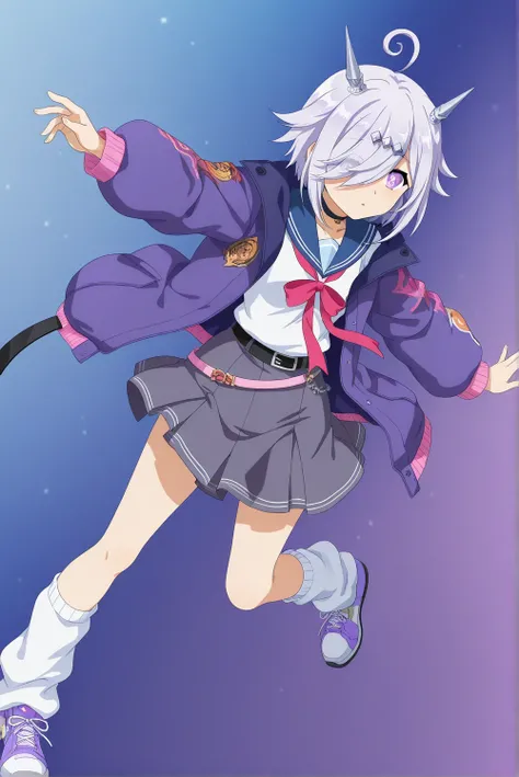 school uniform,blue sailor,white shirt, belt,loose socks, sneakers, purple over size jacket,gray skirt,