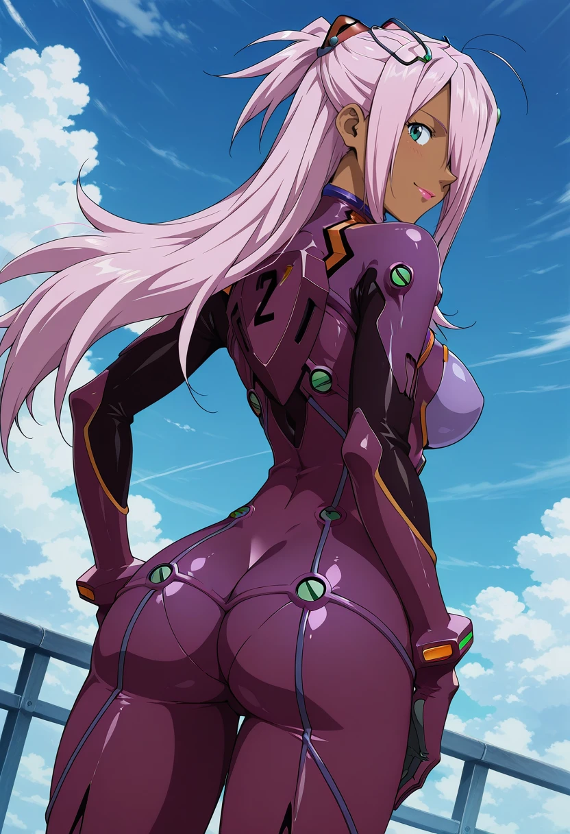 dragogarnet, 1girl, solo, long hair, pink hair, ponytail, ahoge, hair over one eye, green eyes, lipstick, pink lips, large breasts, curvy, large hips, dark-skinned female,Gillard Uniform: