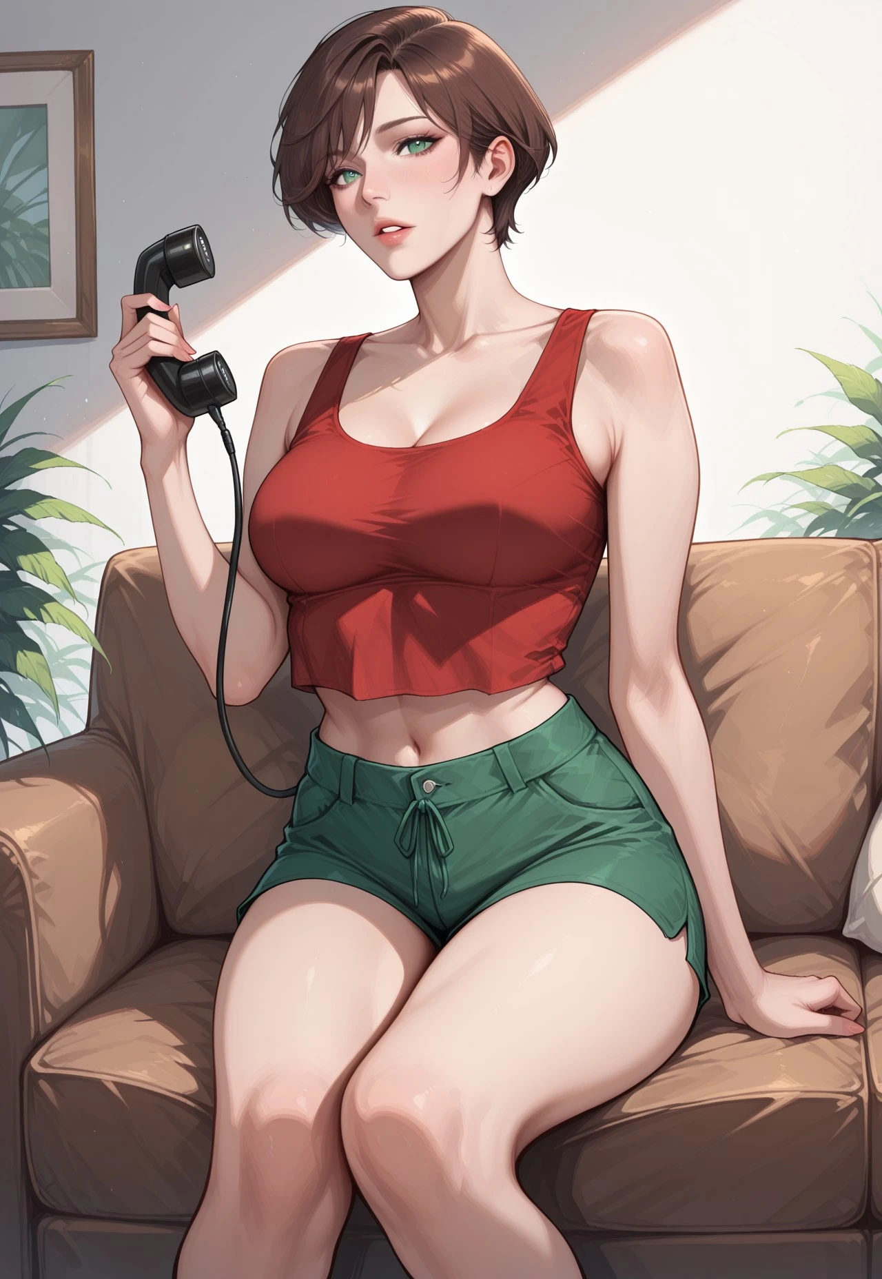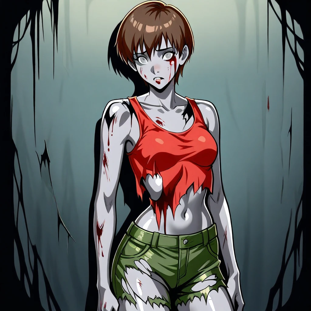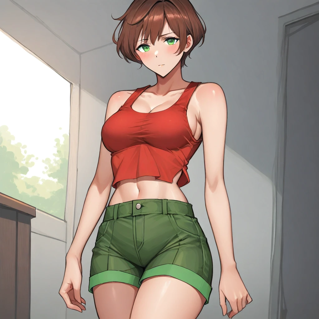 • torn clothes, red tank top, midriff, green shorts, grey eyes,